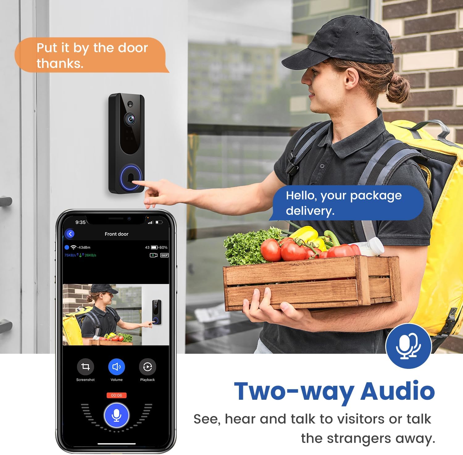 1080p WiFi Video Doorbell Camera Wireless, Battery Powered, AI Human and Motion Detection, 2 Way Talk, Night Vision, Cloud Storage, 2.4G WiFi Only, Indoor/Outdoor Surveillance