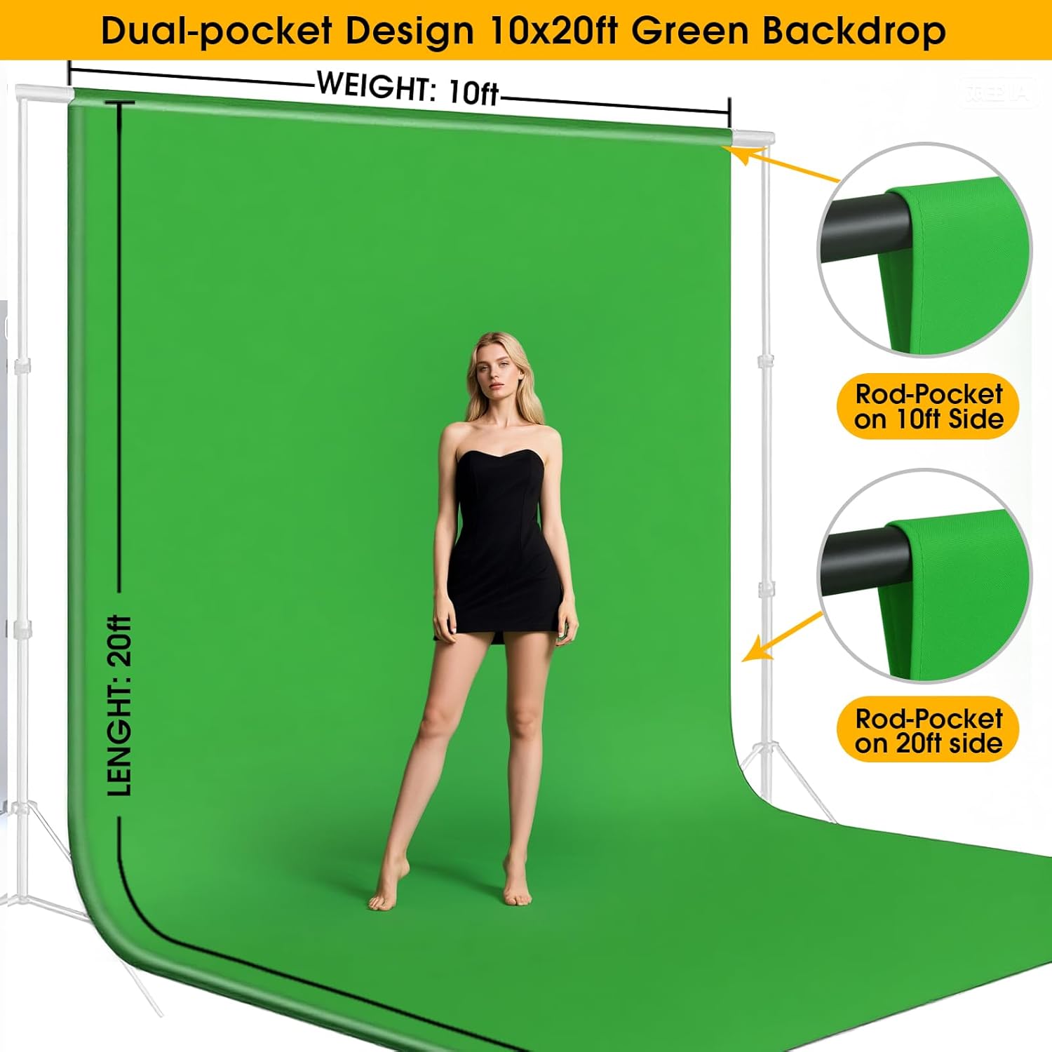 10x20ft Green Screen Backdrop for Photography, Dual-Size Dual-Pocket Design Chromakey Background for Photoshoot, Game Steaming, Zoom Meeting with Both Options of 10 ft and 20 ft in Width