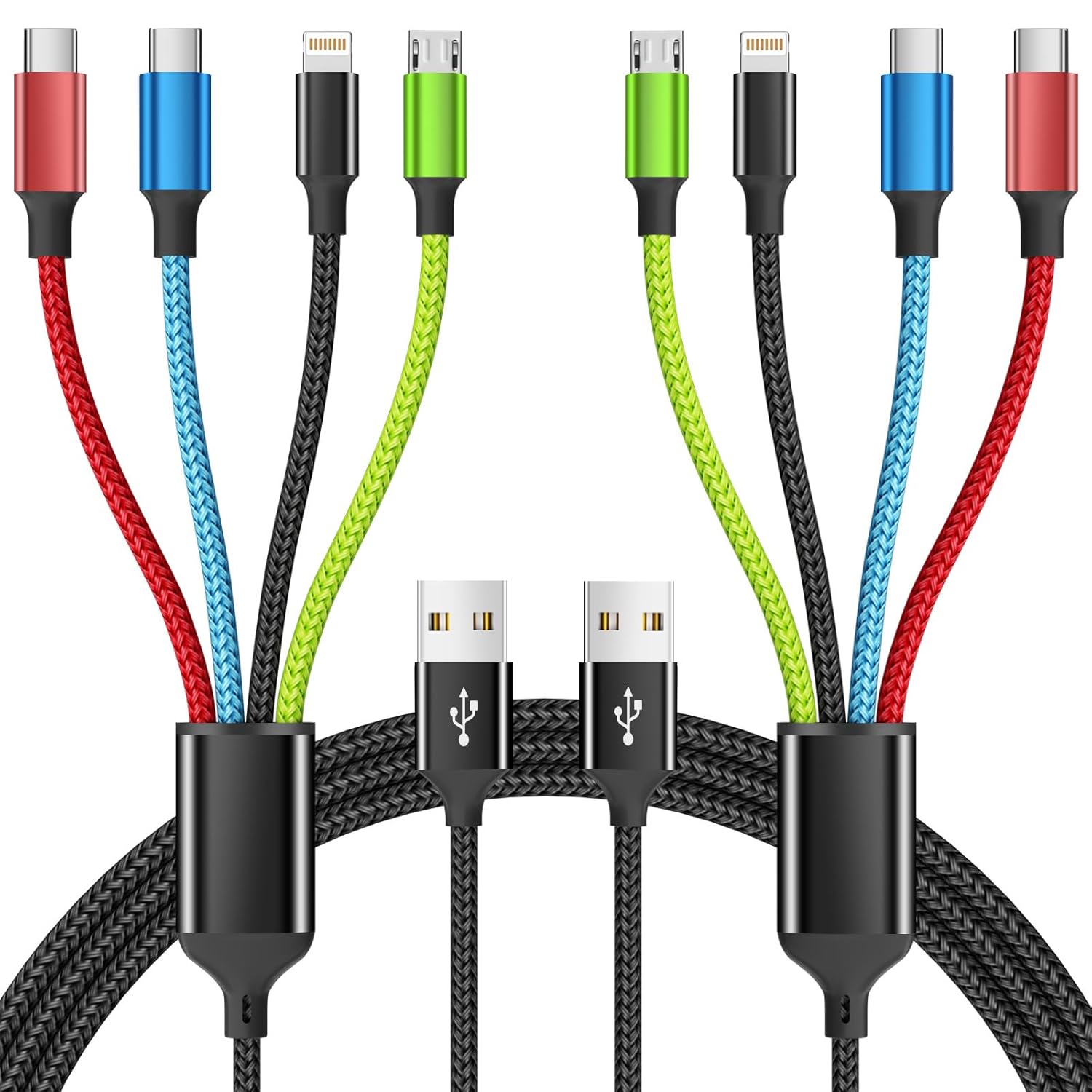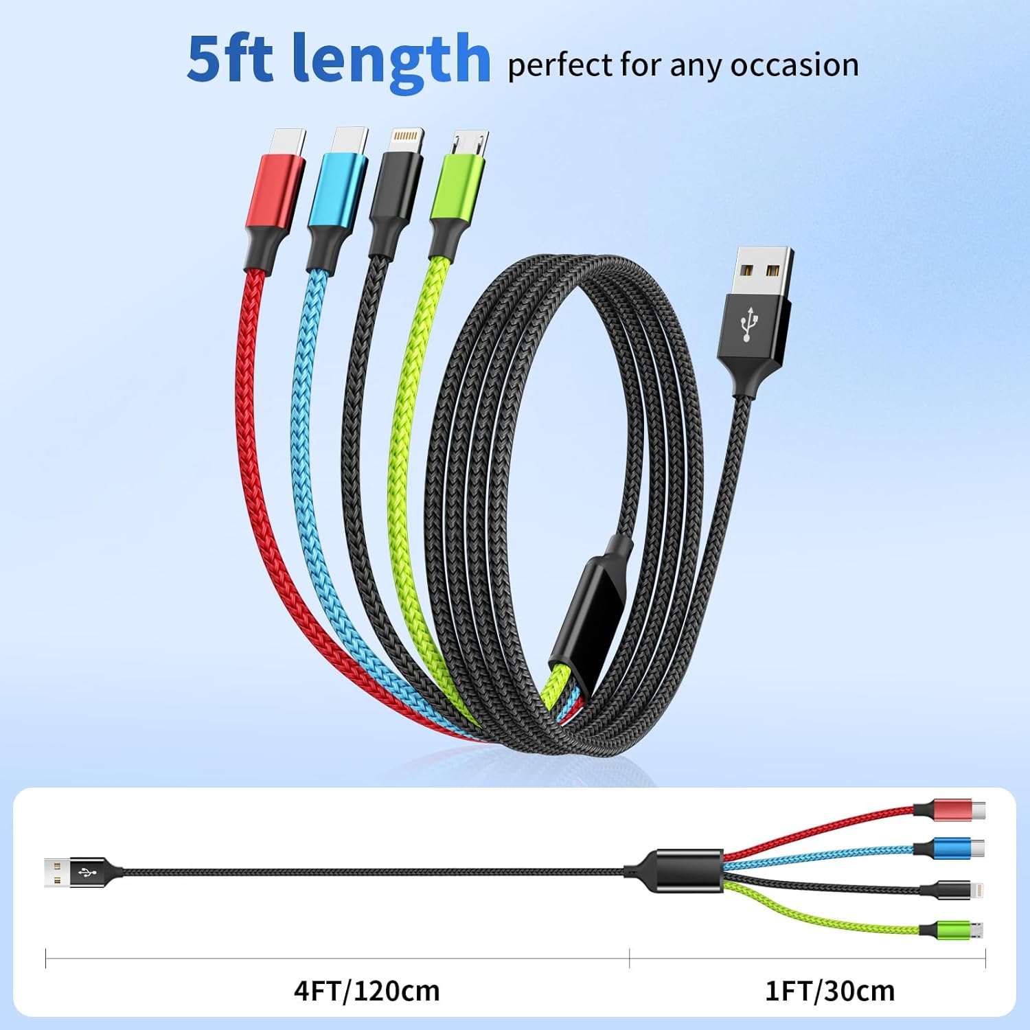 4 in 1 Multi Charging Cable [2Pack 5FT], Tangle Free USB C Car Charger Cable Nylon Braided with 2 USB-C/IP/Micro, Travel Charging Cords for iPhone Android iPad and More