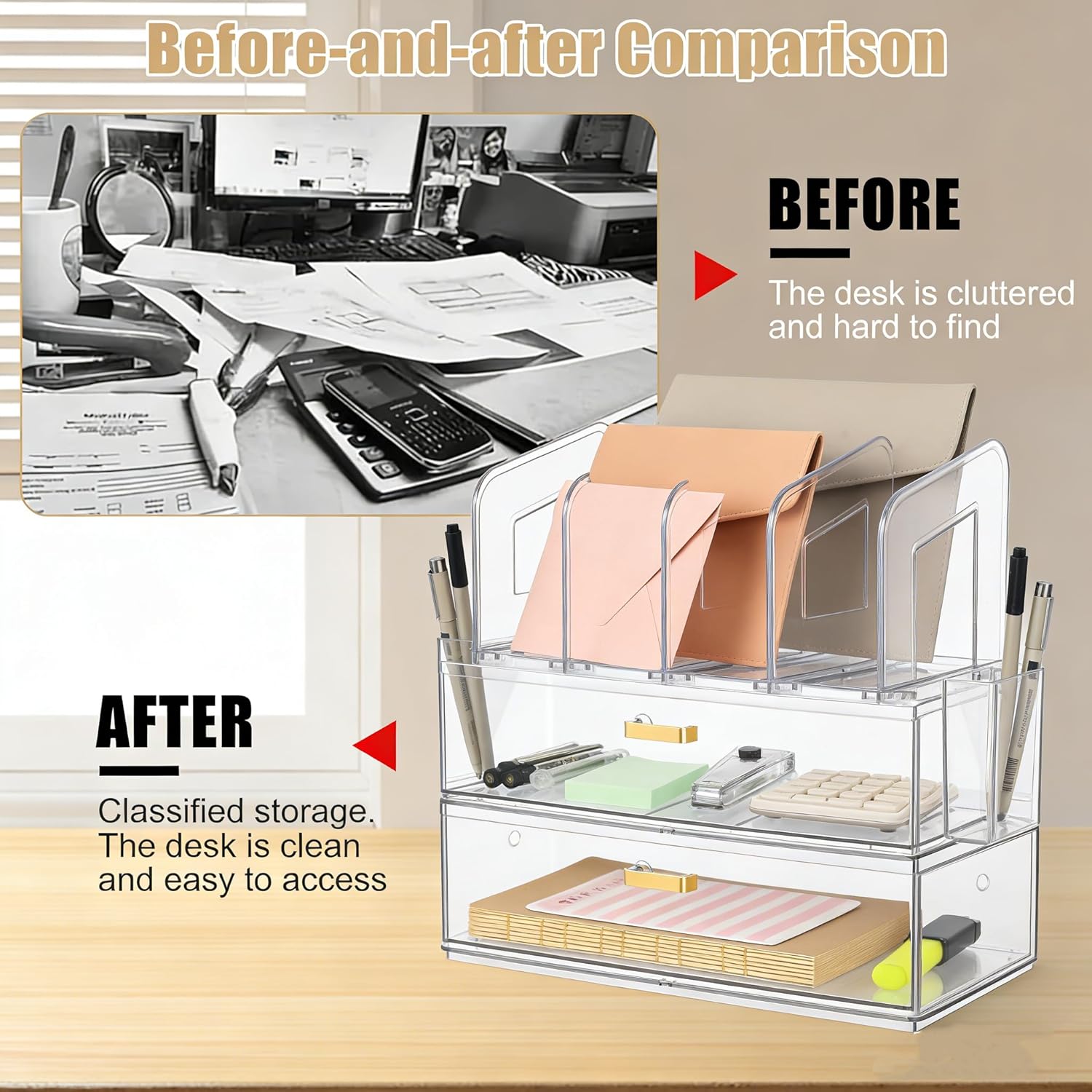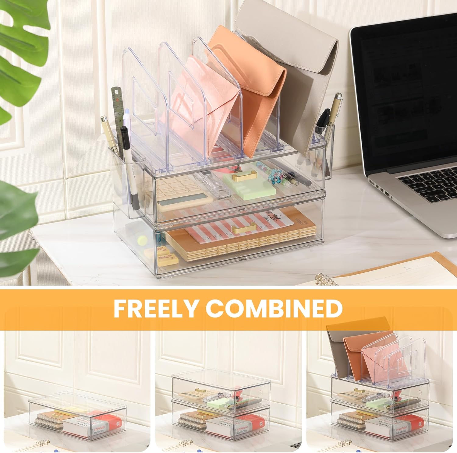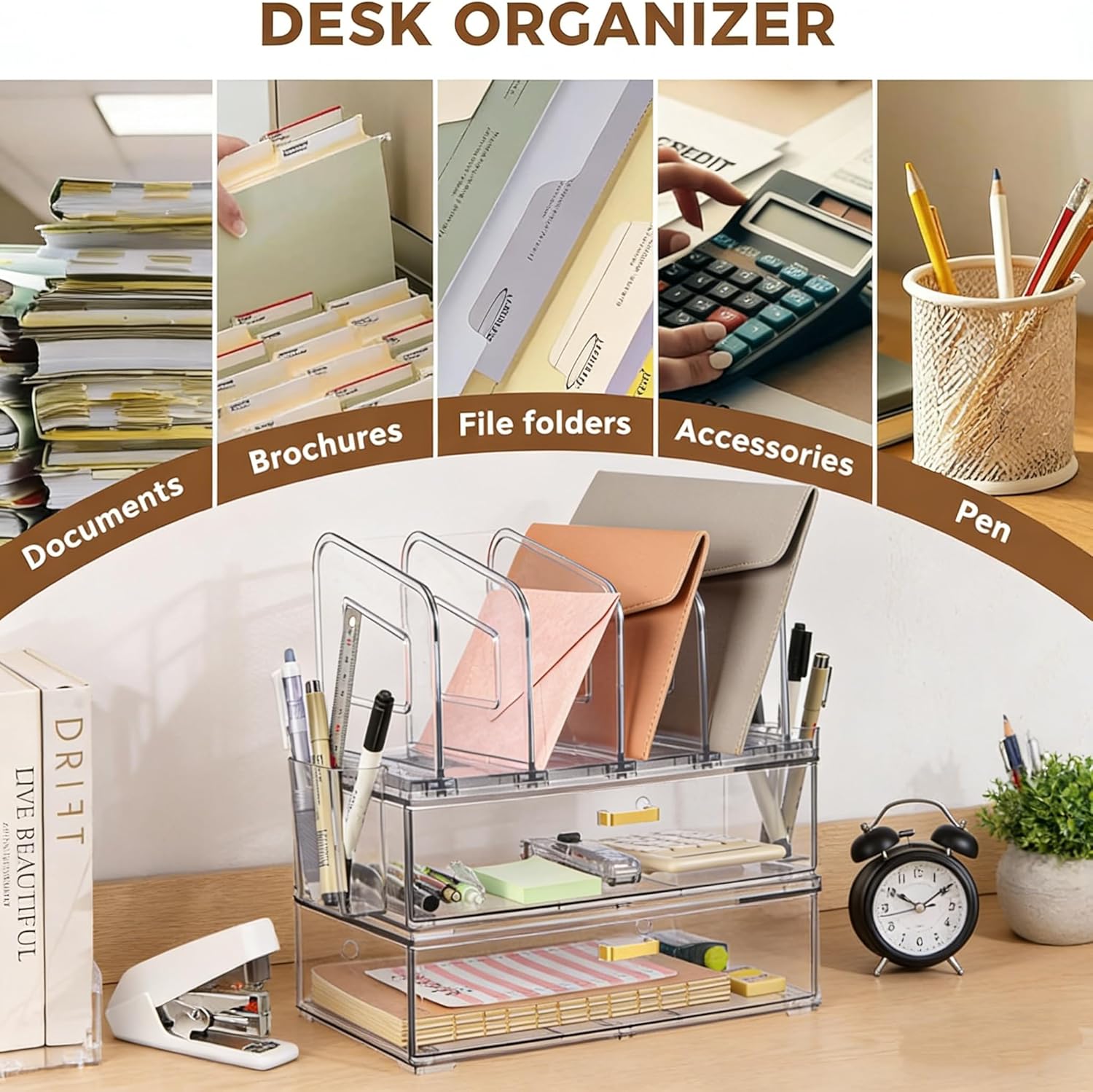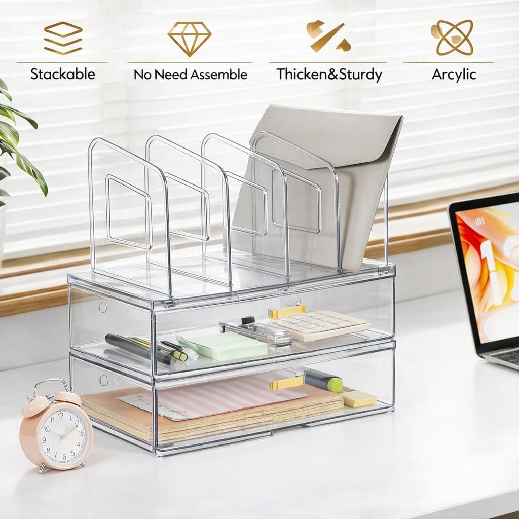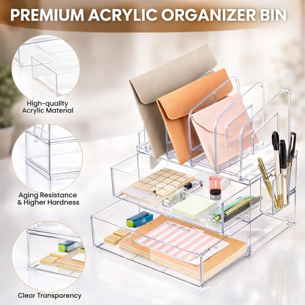 Acrylic Desk Organizer with Drawer, Office Supplies,Organization Storage, 2 PC Drawer Organizer with 4 File Sorter, Desk Organizers and Accessories, Clear Acrylic File Organizer