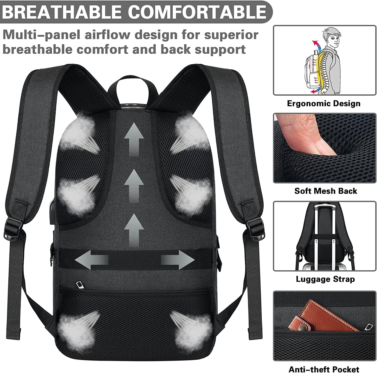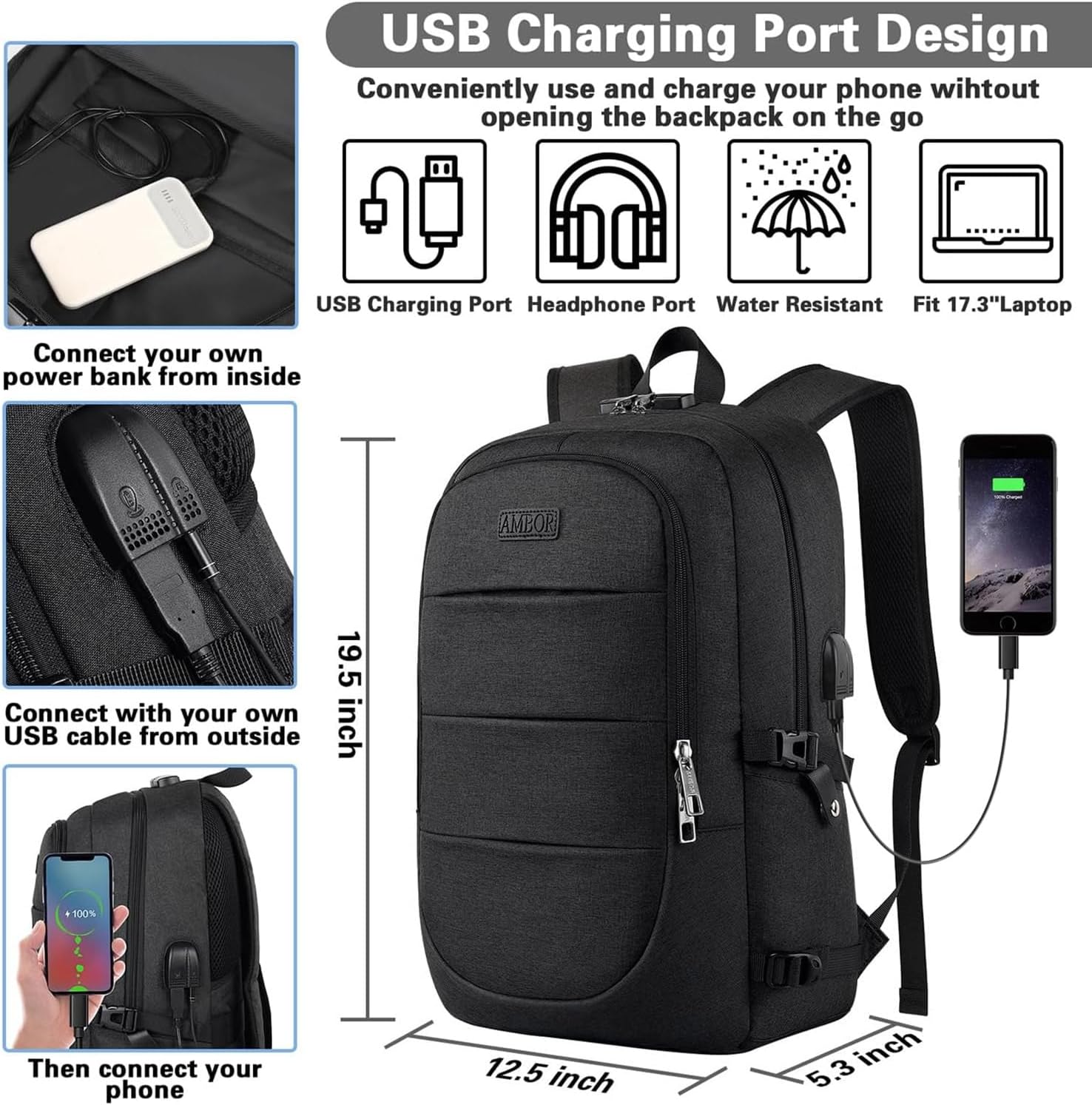 AMBOR Travel Laptop Backpack for Men, 15.6-17.3 inch Laptop Backpack, Anti Theft Business Work Backpack with USB Charging Port, Water Resistant Computer Bag for Men & Women, Black