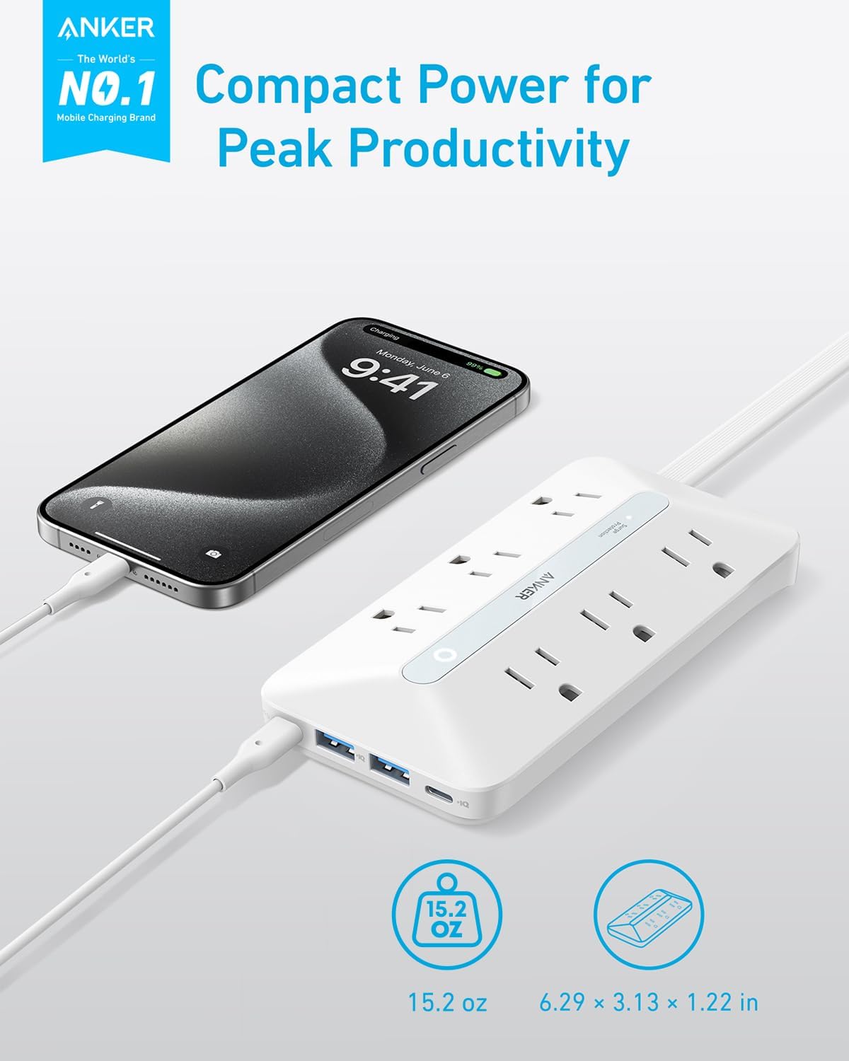 Anker Power Strip with 300J Surge Protector, Flat Plug Extension Cord with Multiple Outlets, 6 AC, 2 USB A & 2 USB C Ports for 20W, 5ft Outlet Extender, Dorm Room Essentials, Home Office