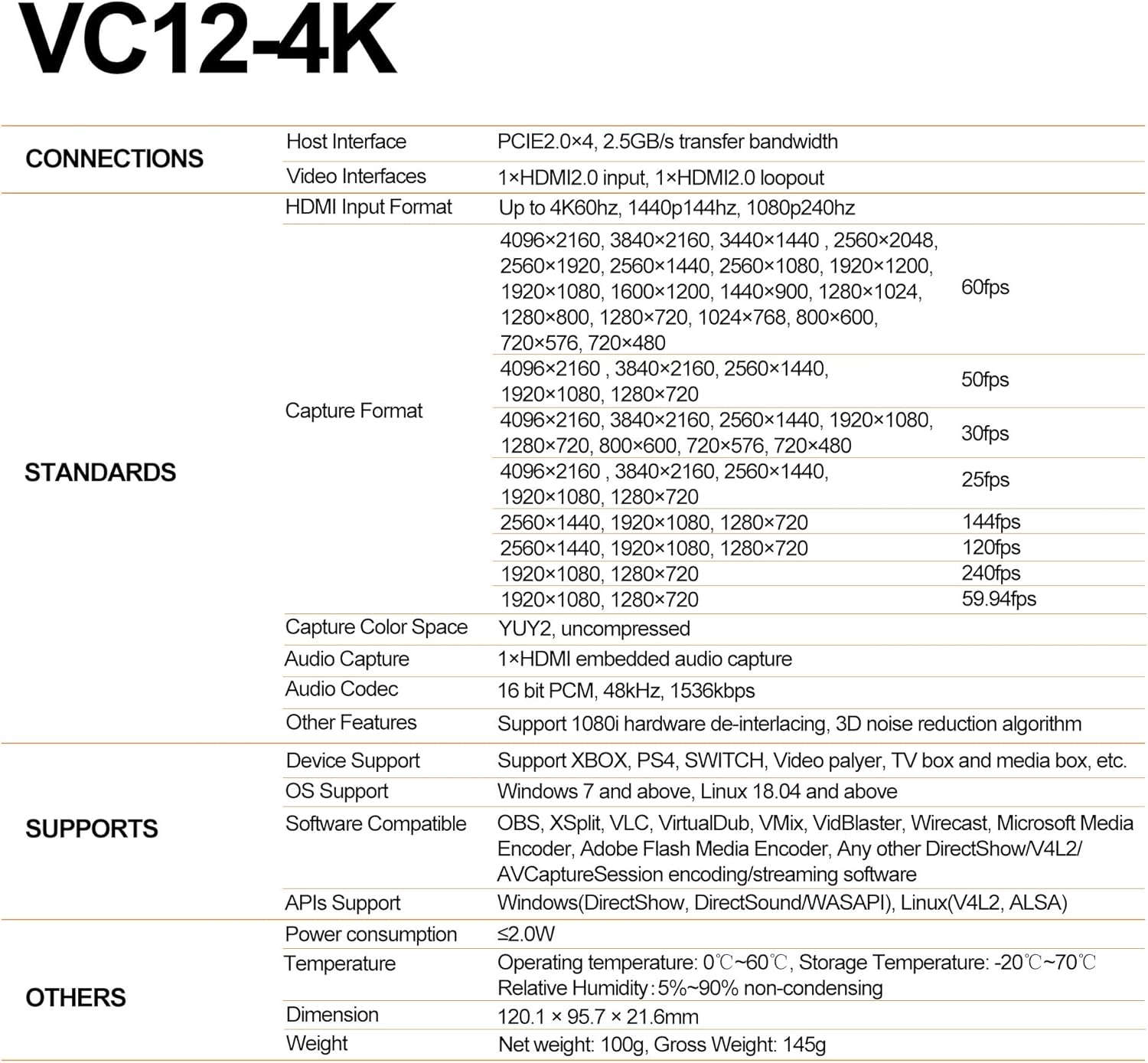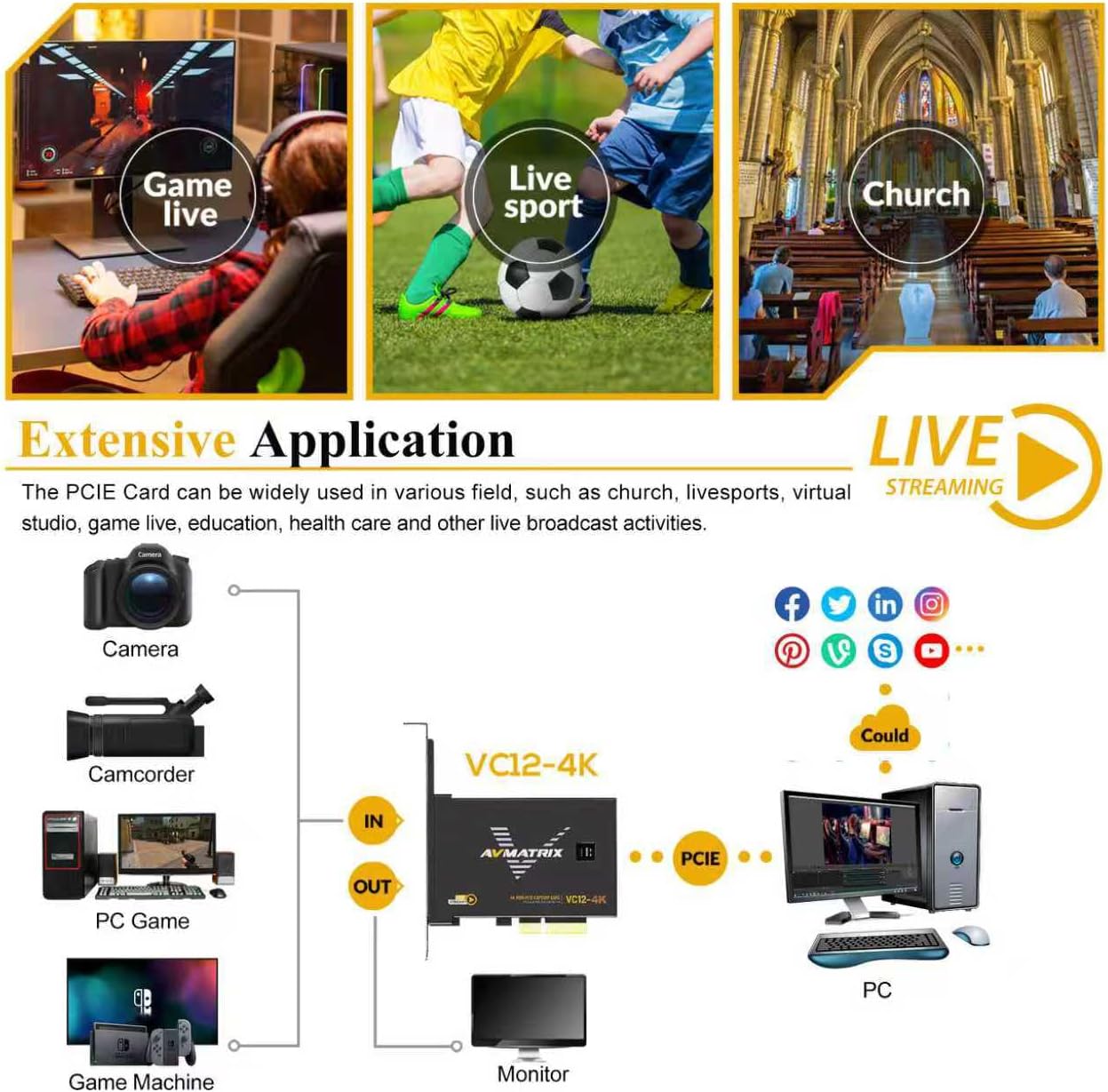 AVMATRIX VC12-4K PCIE Capture Card 4k for Game Livestream and Record in 4K60 UHD with Ultra-Low Latency on PS5 PS4/Pro Xbox Series X/S Xbox One X/S in OBS Works with Windows and Linux