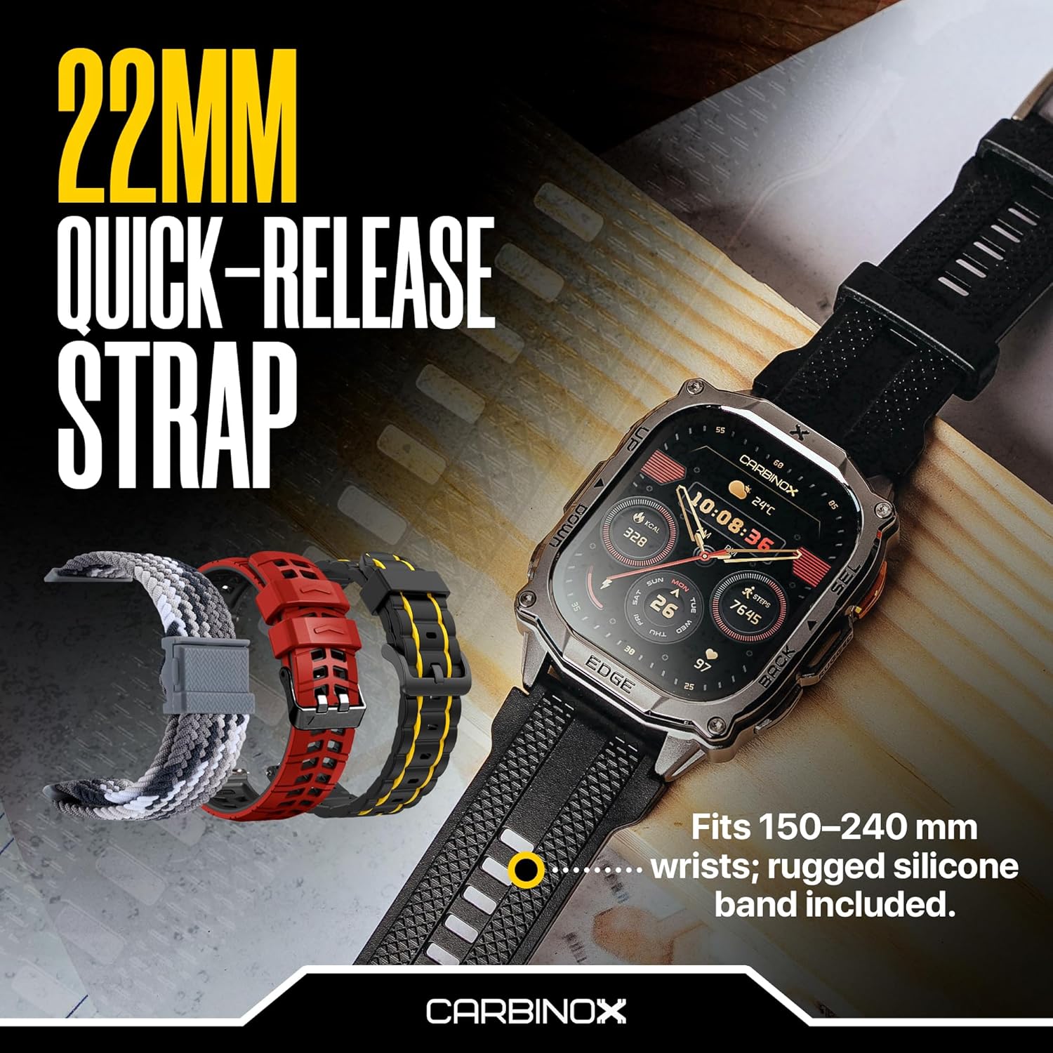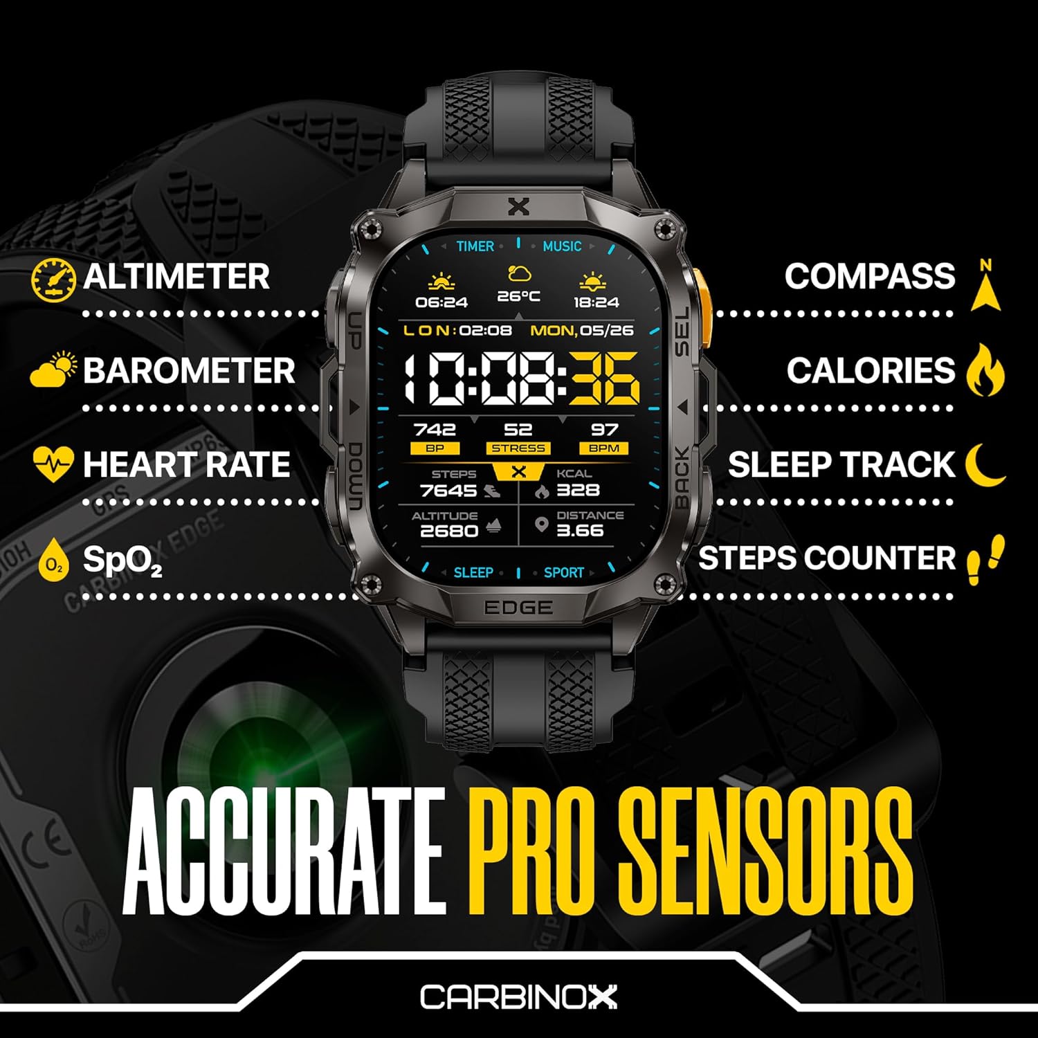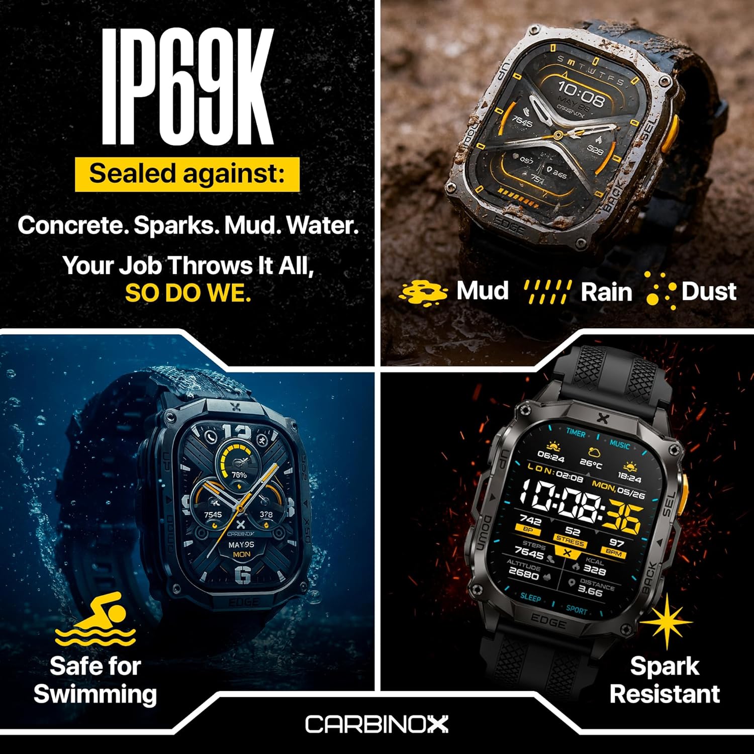 CARBINOX Edge Smart Watch Rugged, 1.96″ AMOLED, Stainless Steel, IP69K/5ATM Fitness trackers, Dual-Band GNSS, 500mAh, Bluetooth Calls, Smart Watch for Android Phones iOS (Black)