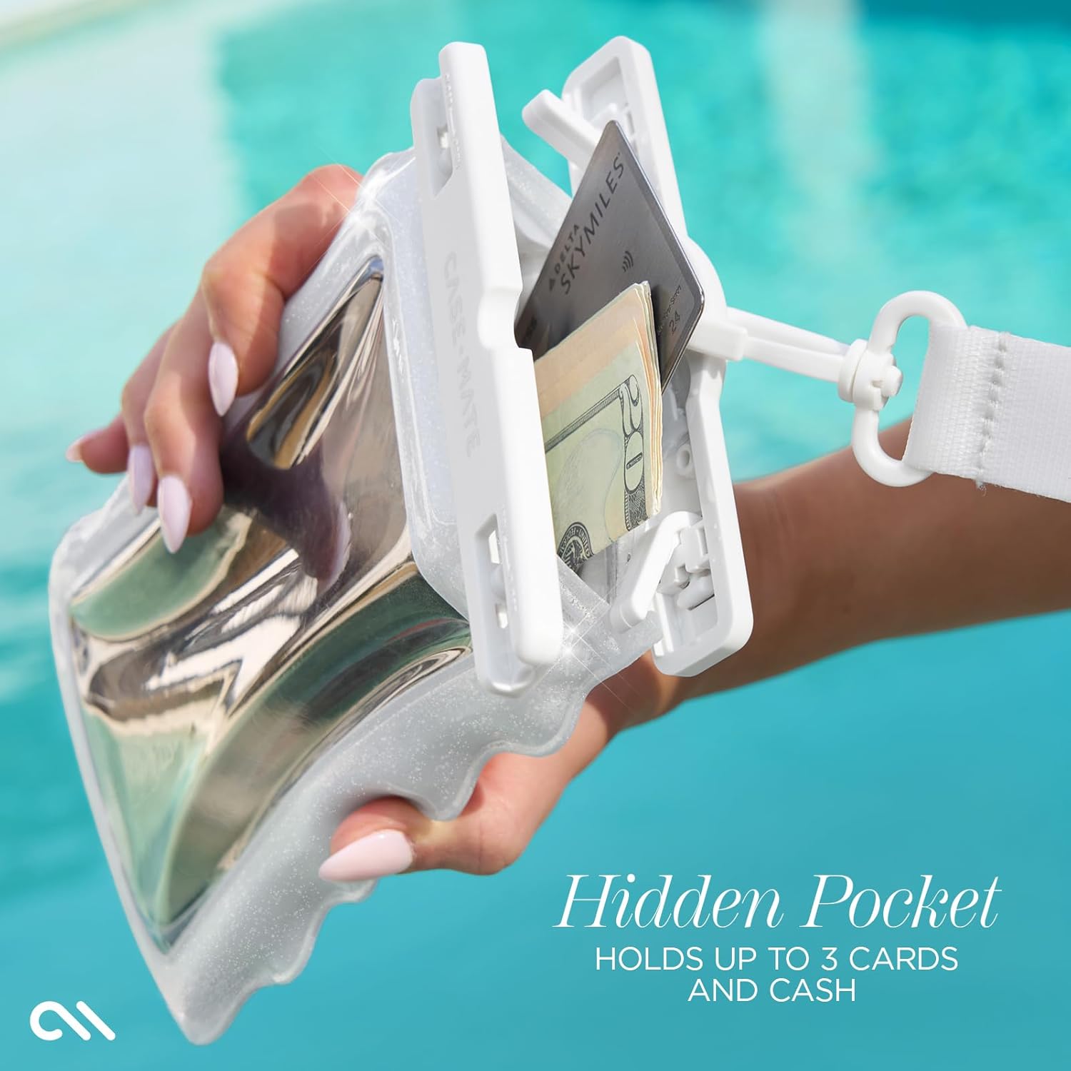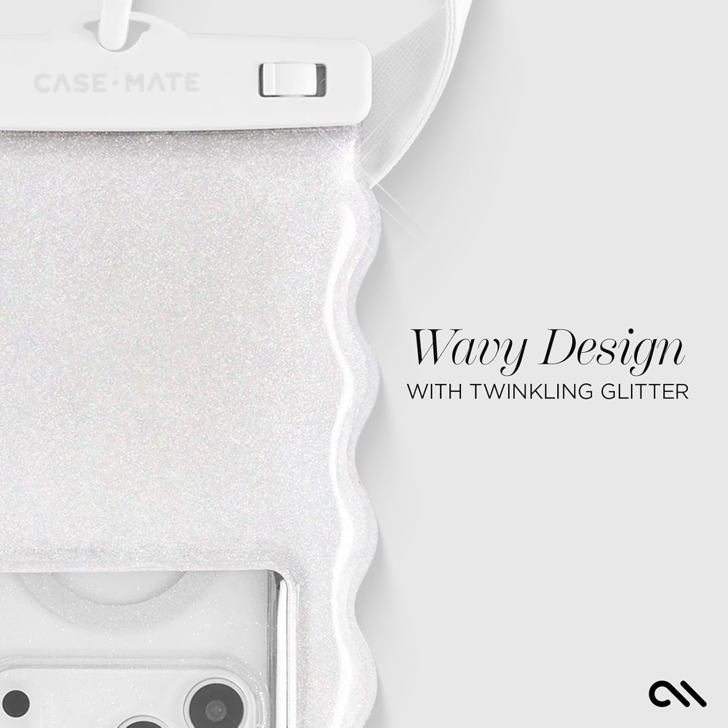 Introducing the Case-Mate Wavy IP68 Waterproof Phone Pouch, designed for those who love to combine style with practicality. This large floating phone case features a unique wavy design with twinkling glitter, making it a fashionable choice for any adventure. The pouch is equipped with a hidden pocket, perfect for storing cards, cash, and IDs, ensuring you have everything you need at your fingertips.