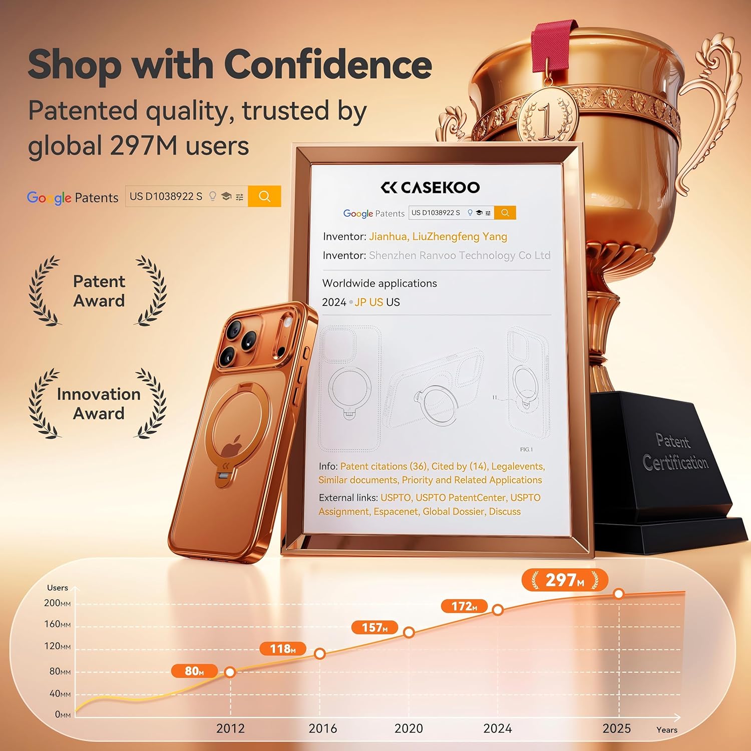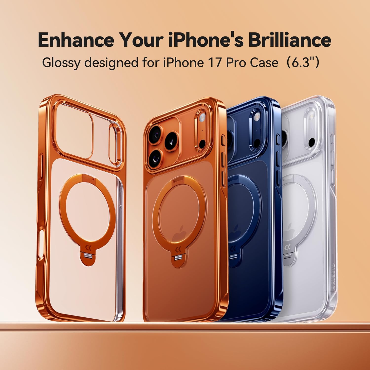 CASEKOO 360 Spin Magnetic Stand for iPhone 17 Pro Phone Case with [Fit for MagSafe][17FT Military Protection] Slim Polished Frame Titanium Alloy Sturdy Stand 6.3″, Glossy Cosmic Orange