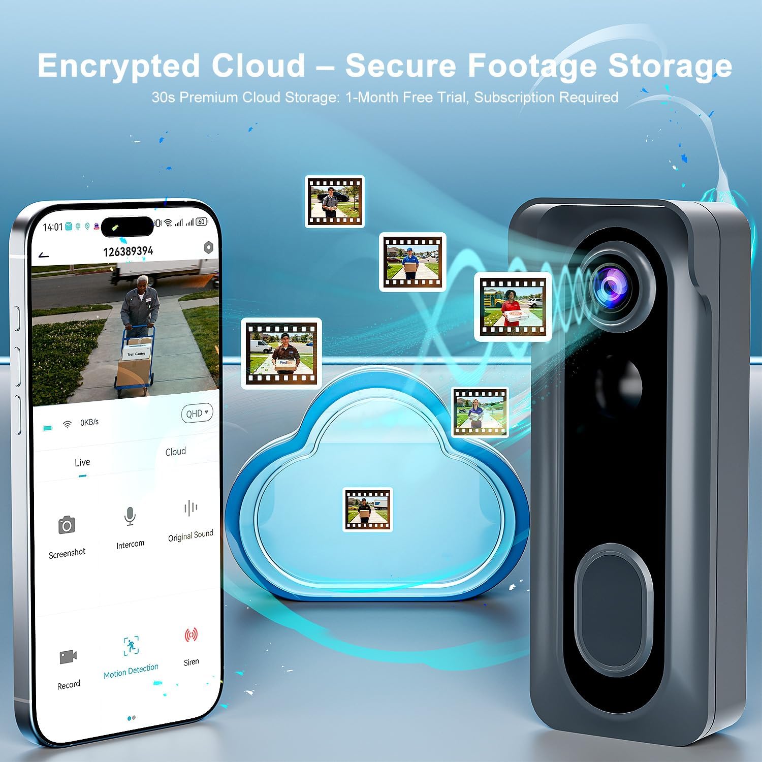 Doorbell Camera Wireless with Chime -2K HD Video AI Motion Detection, Two – Way Audio, Night Vision, Cloud Storage,Battery Powered – Compatible with Alexa, 2.4G WiFi Only
