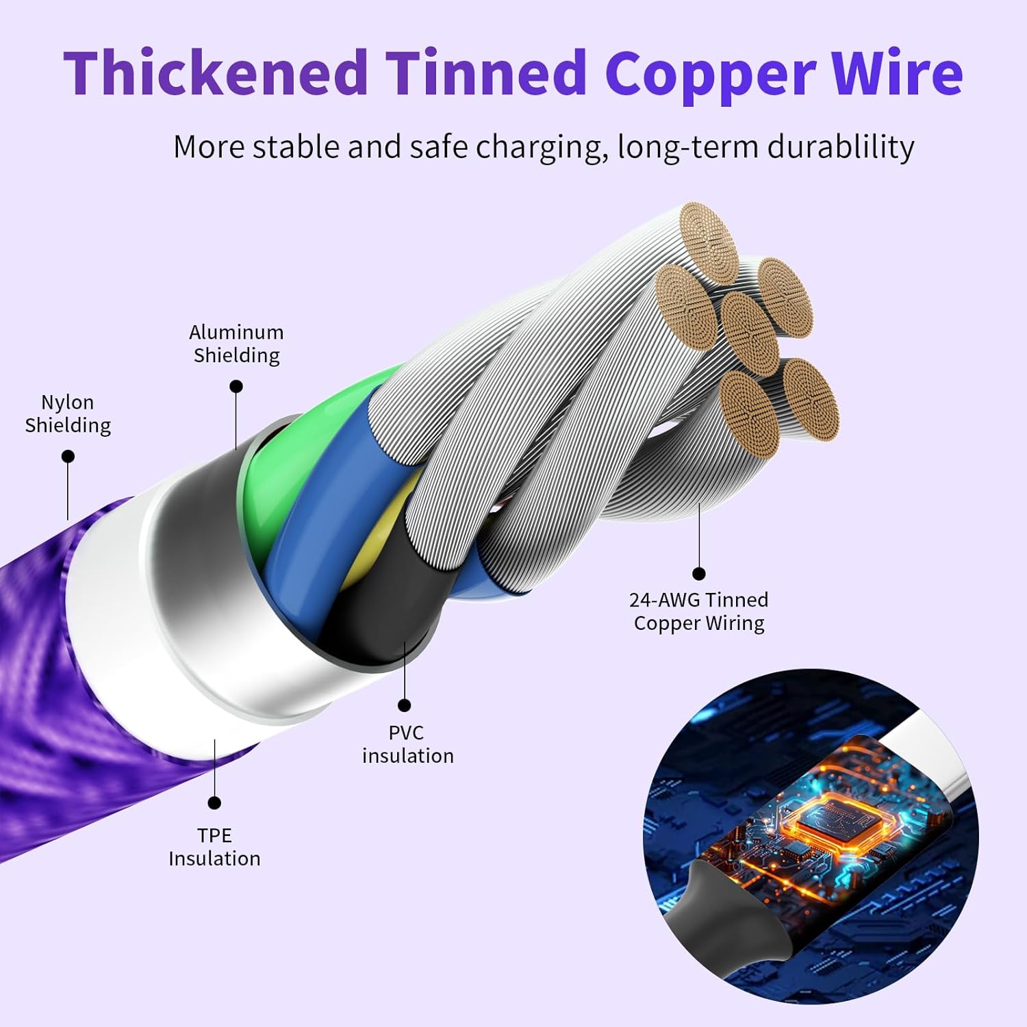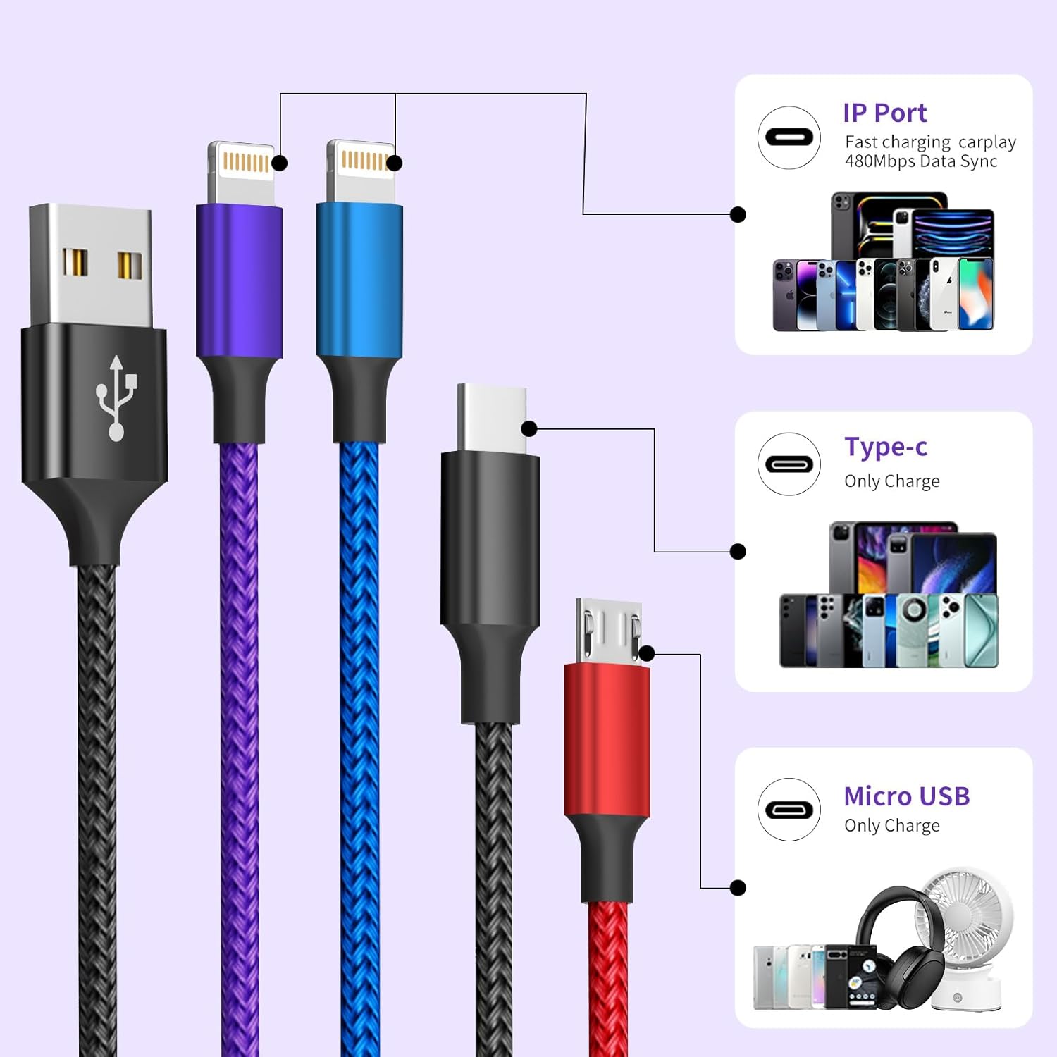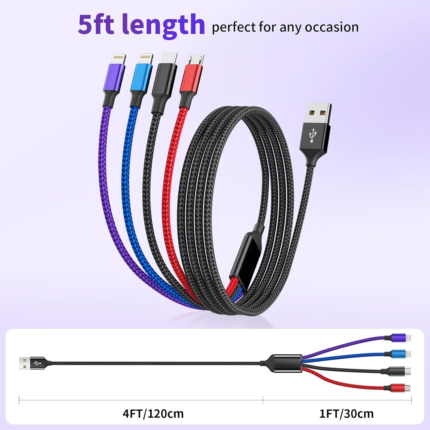 Dual IP 4 in 1 Multi Charging Cable [1Pack 5FT], Nylon 4 in 1 Charging Cable, Multi Chargers for All Devices with IP/IP/Type C/Micro Port, Compatible with Most Cell Phones/Tablets and More