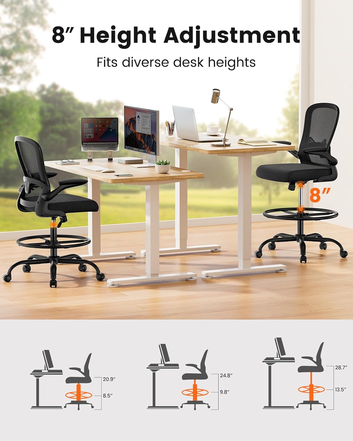 ErGear Drafting Chair, Standing Desk Chair with Flip-Up Armrests, High Desk Chair Adjustable Height, Ergonomic Tall Office Chair with Lumbar Support and Adjustable Footrest Ring