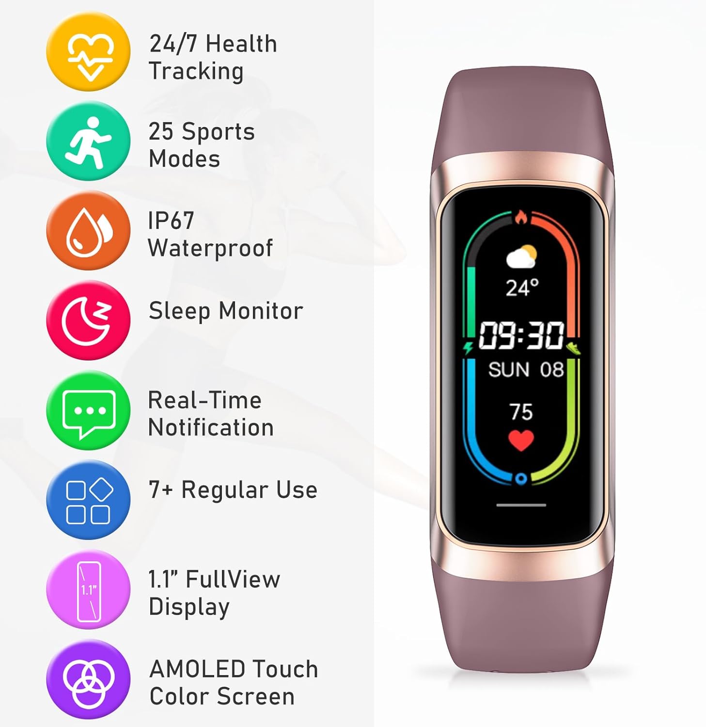 Fitness Tracker with 24/7Heart Rate, Blood Pressure, Sleep Tracking, Calorie, Activity Tracker with 1.1″ AMOLED Color Screen, Waterproof Step Tracker for Android iPhones Women Men