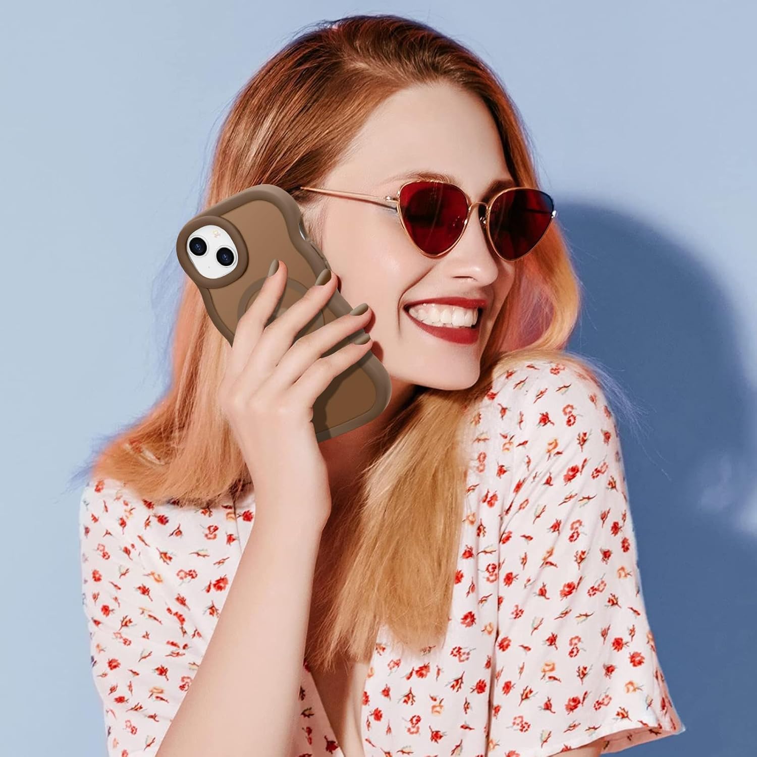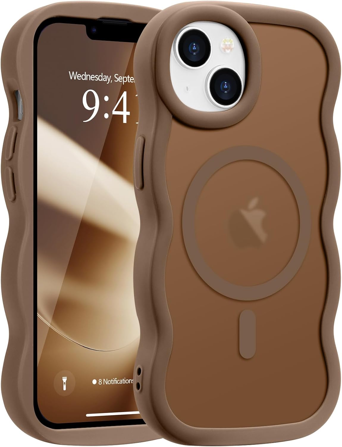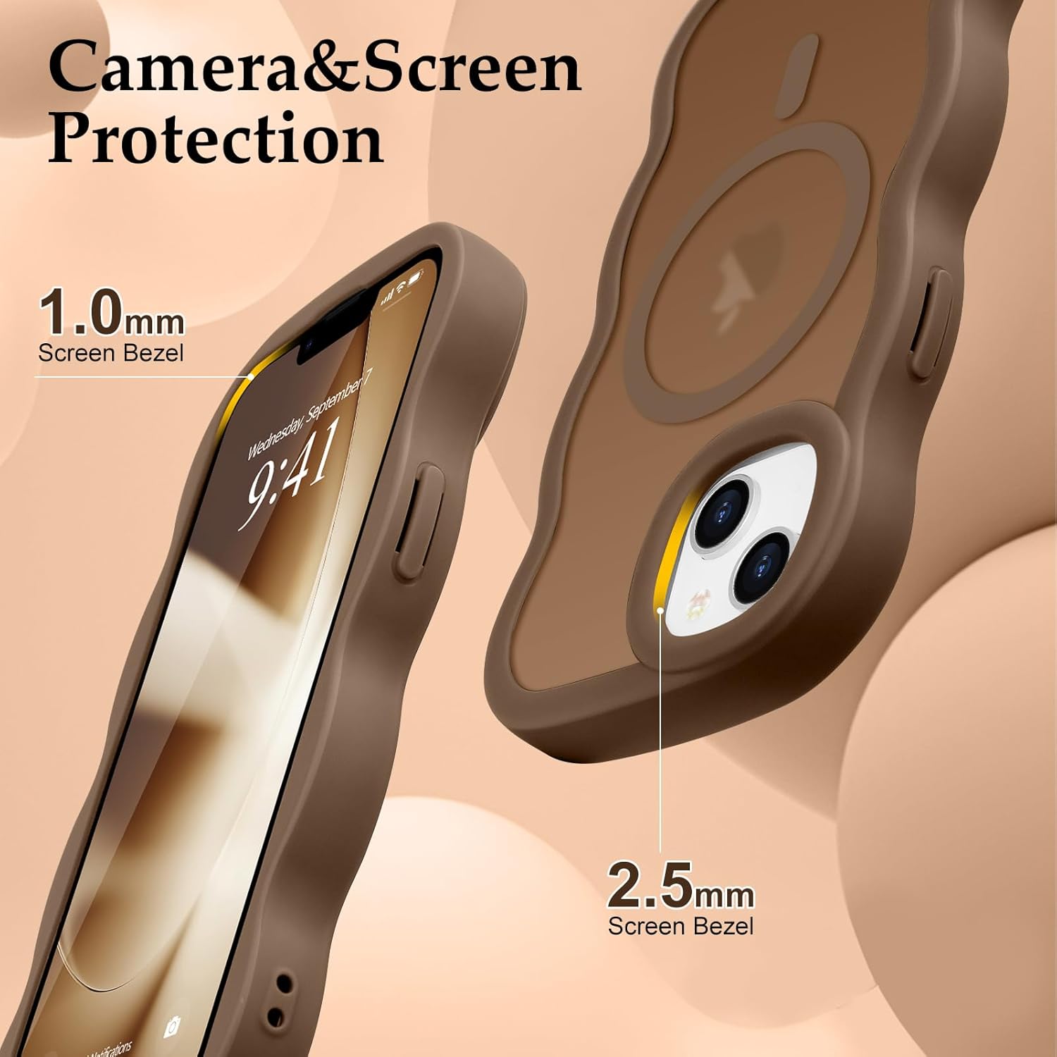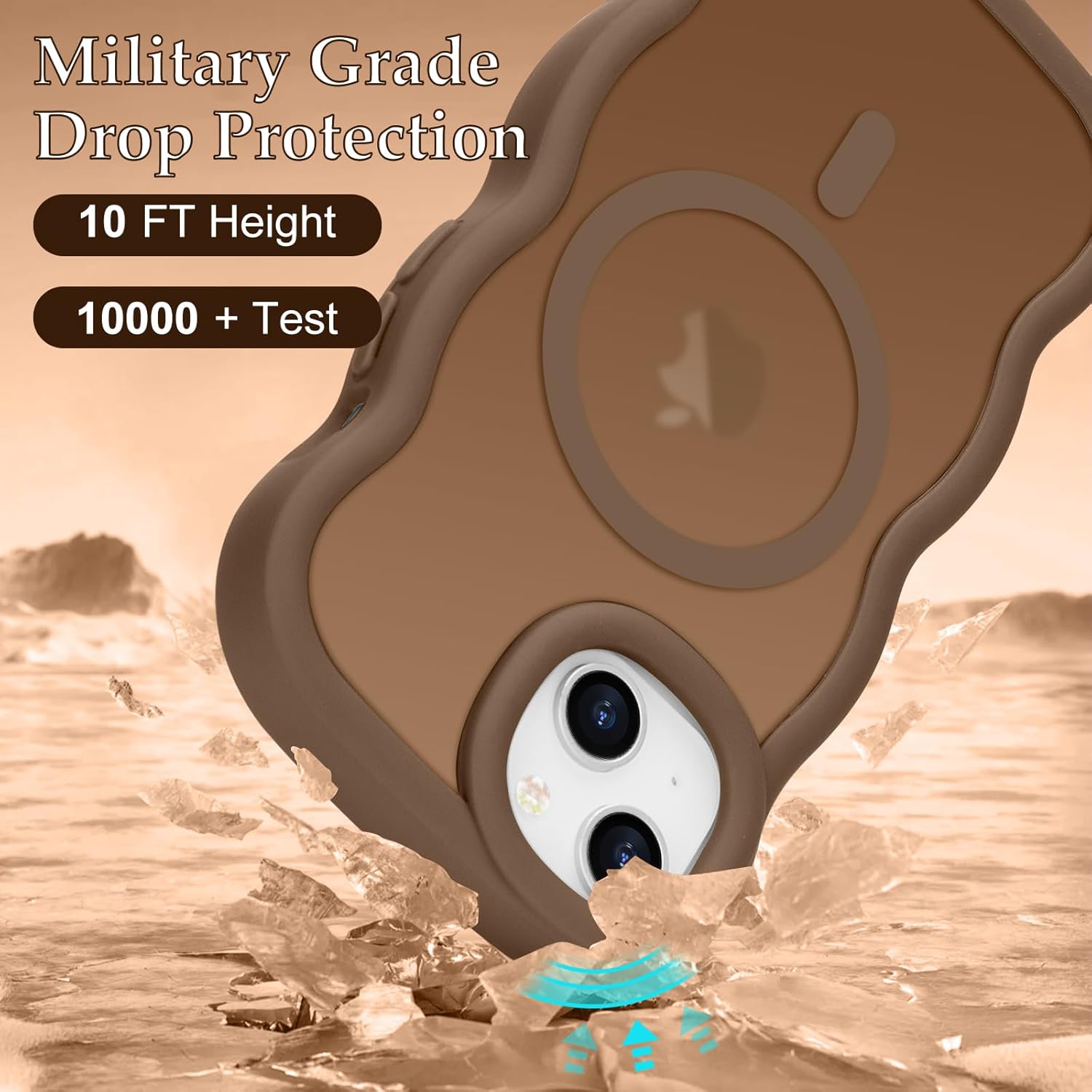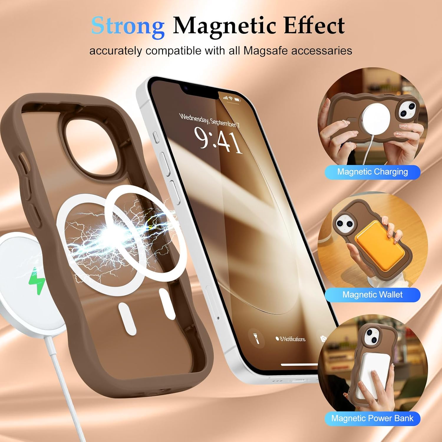 for iPhone 13/14 Case, Curly Wave Frame Hard Translucent Clear Back Cover for Women Men Compatible with Magsafe Stylish TPU Shockproof Drop Protection Phone Case for iPhone 14/13, Desert Gold