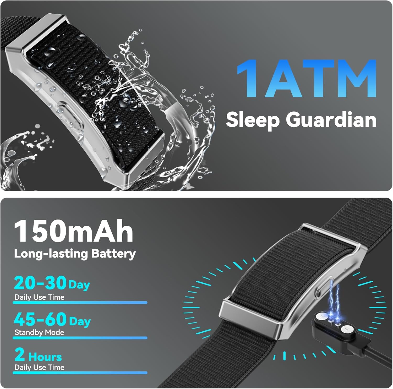 Health Smart Bracelet, Wearable Activity & Fitness Tracker Band, 24H Sleep Tracker, All-Day Continuous Heart Rate/HRV/Stress Monitor/1ATM Waterproof, 120+ Sports Modes, Free App