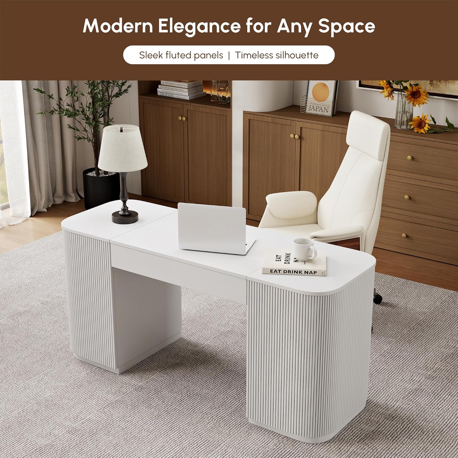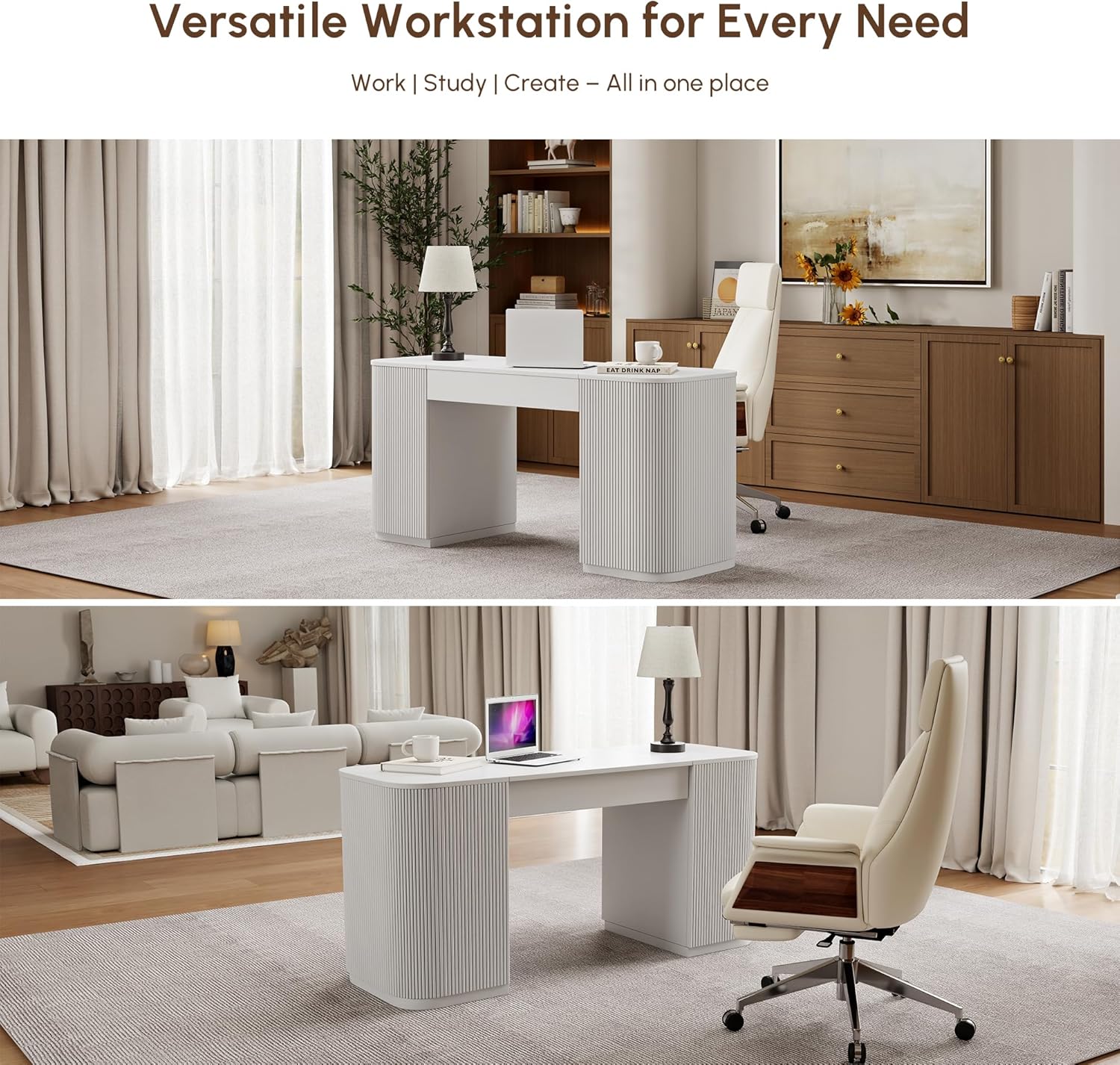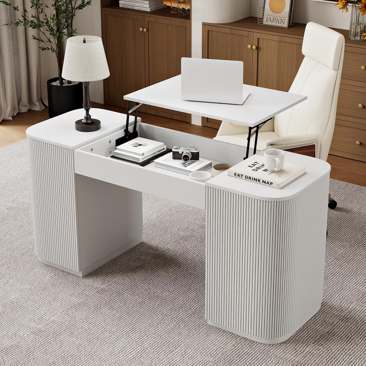 homary Modern 59.8″ Standing Desk with Lift-Top & Ample Storage, Fluted Engineered Wood Home Office Desk with 2 Doors, White