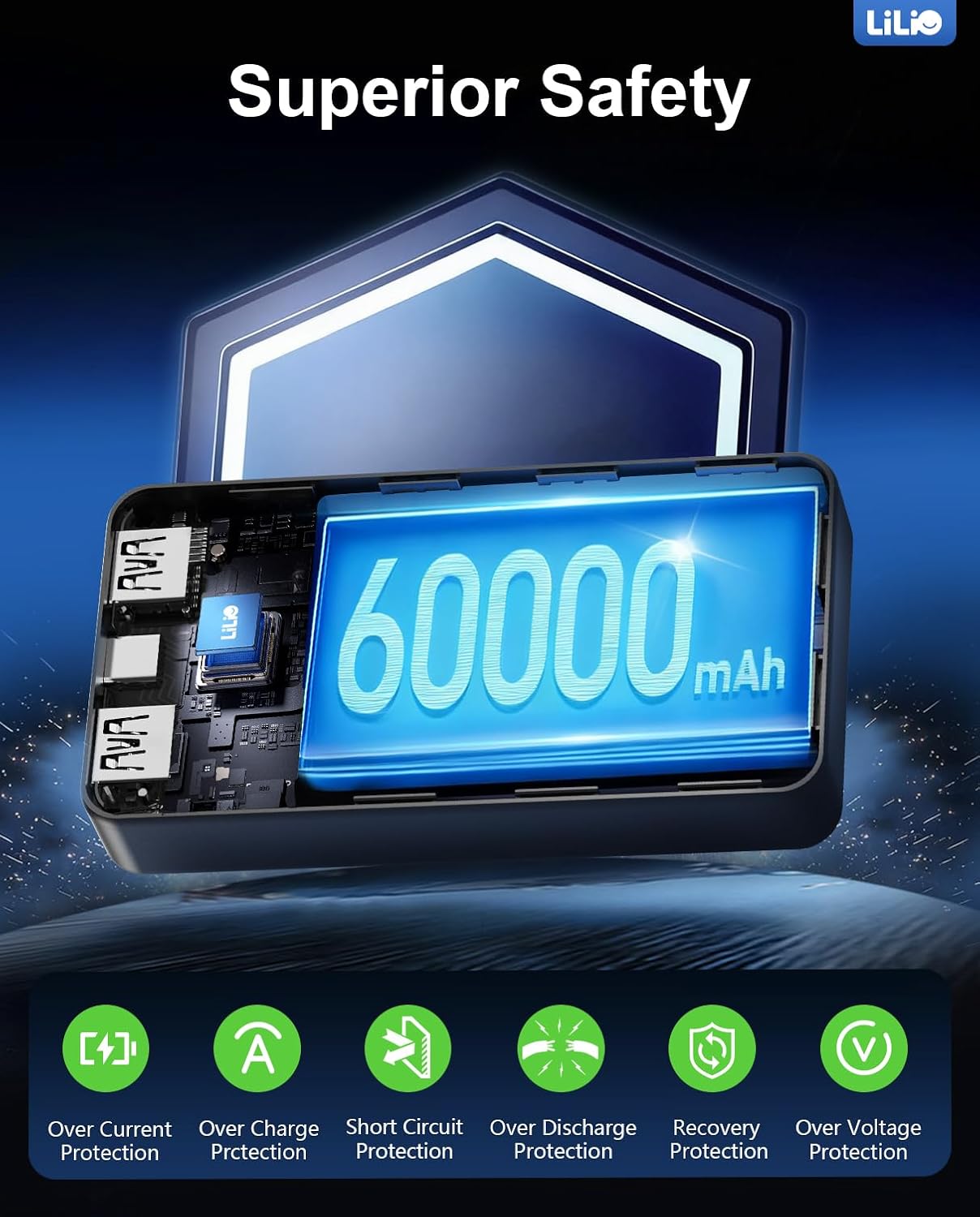 LILIO Portable Charger Power Bank,60,000mAh Battery Pack, 22.5W Power Bank Fast Charging with USB Cable, Phone Charger for iPhone 17/16/15/14/13 All Series/Samsung/Android, Camping Essentials, Black