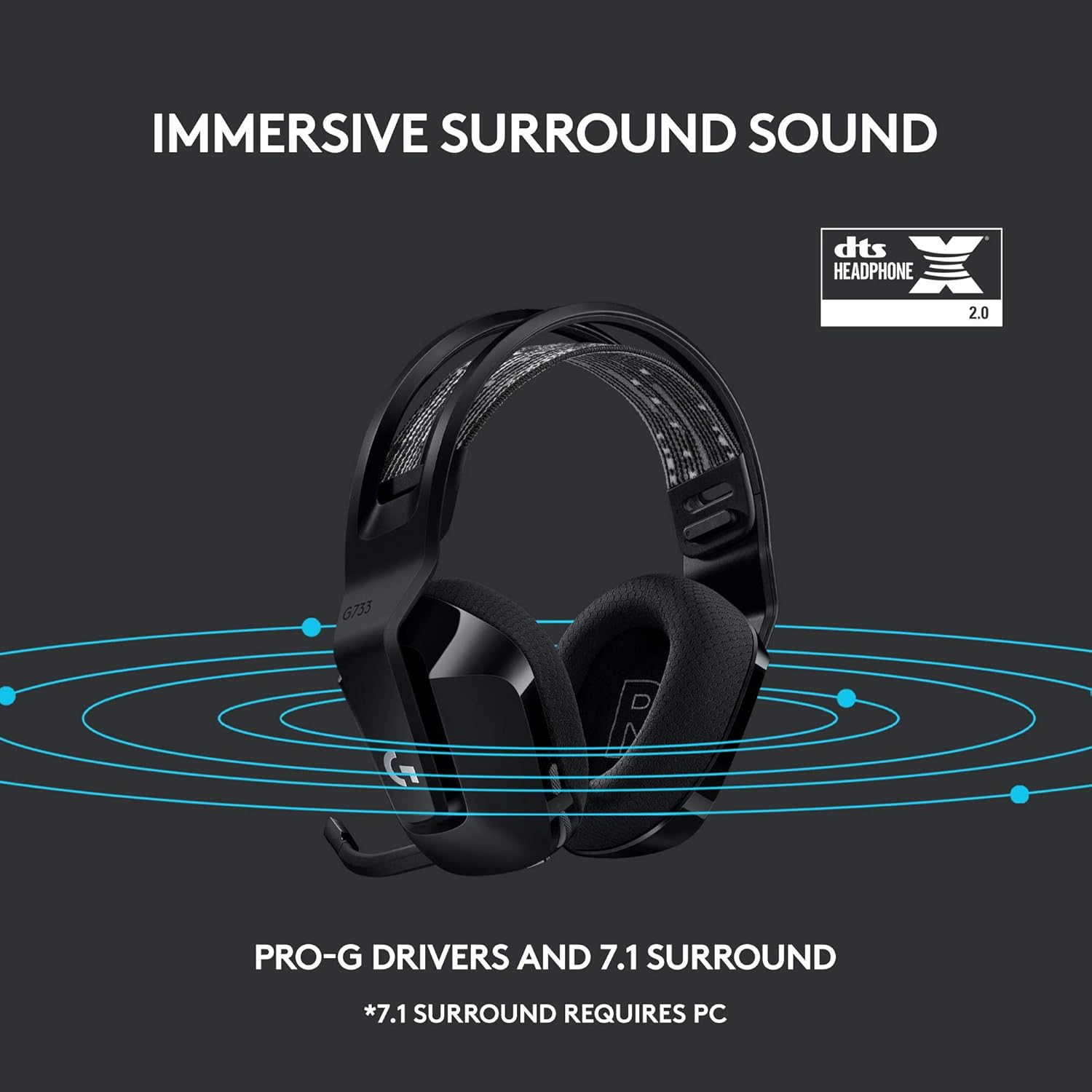 Logitech G733 Lightspeed Wireless Gaming Headset, Suspension Headband, Lightsync RGB, Blue VO!CE Mic, PRO-G Audio – Black, Gaming Headset Wireless, PC, PS5, PS4, Switch Compatible