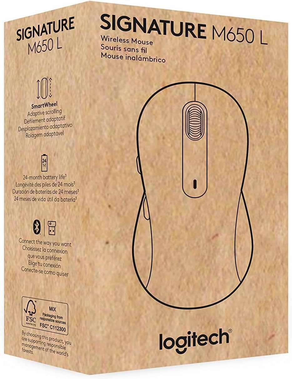 Logitech Wireless Mouse Signature M650 L Full Size – Large Hand Size, 2-Year Battery, Silent Clicks, Customizable Buttons, Bluetooth, PC/Mac/Chromebook – Black, Right-Handed
