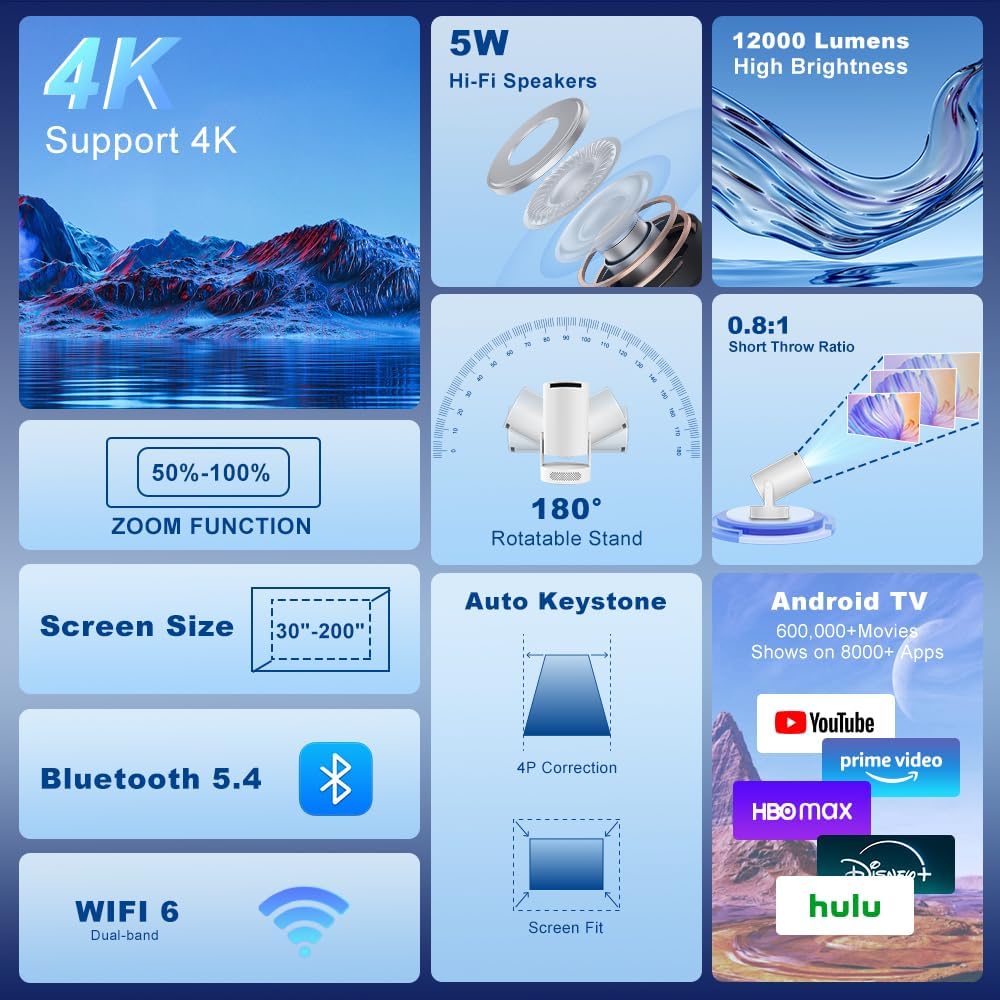 Mini Projector with Wifi and Bluetooth 5.4, Short Throw Projector 4K, Built-in Apps, 250 ANSI Lumens, Auto Keystone Correction, Smart Projector for Home Outdoor Movies [ 2026 Upgrade, White ]