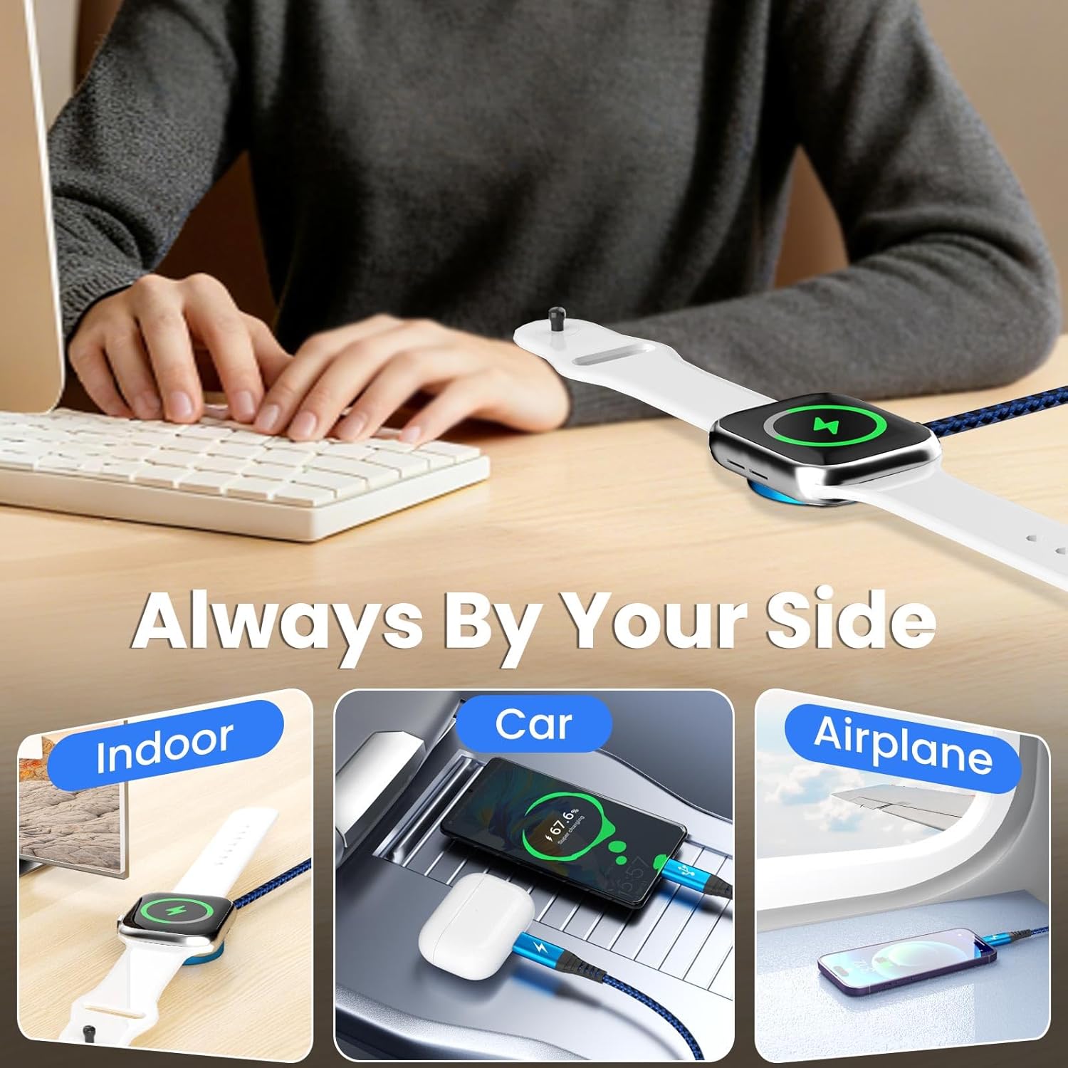 Multi Charging Cable for iPhone Watch Charger, 4 in 2 USB A/C Phone Charger Cord with Dual Type-C/IP, iWatch Cable Nylon Travel Essentials Compatible with iWatch/Phone 17-11/Pod/Android, 5FT