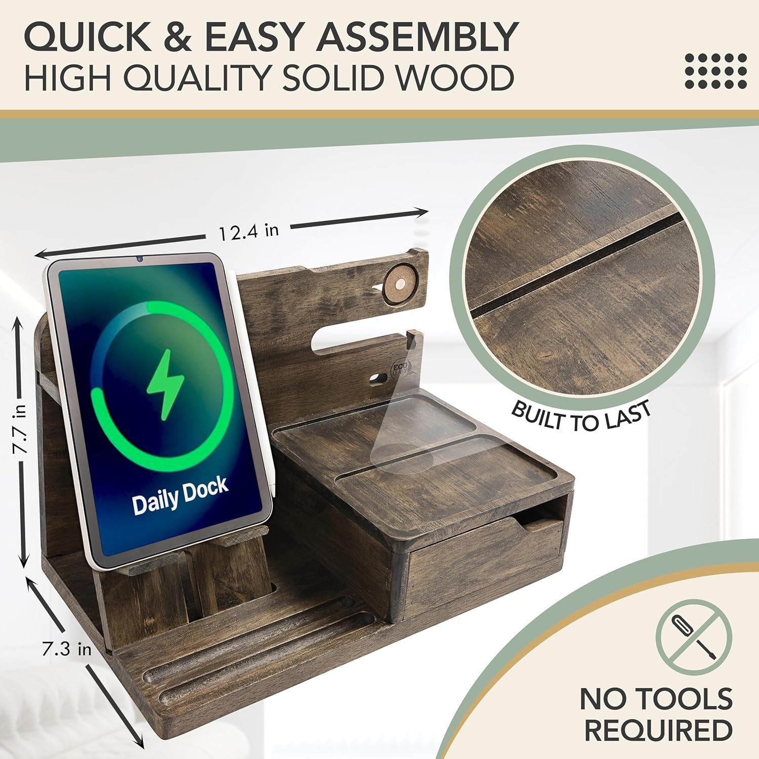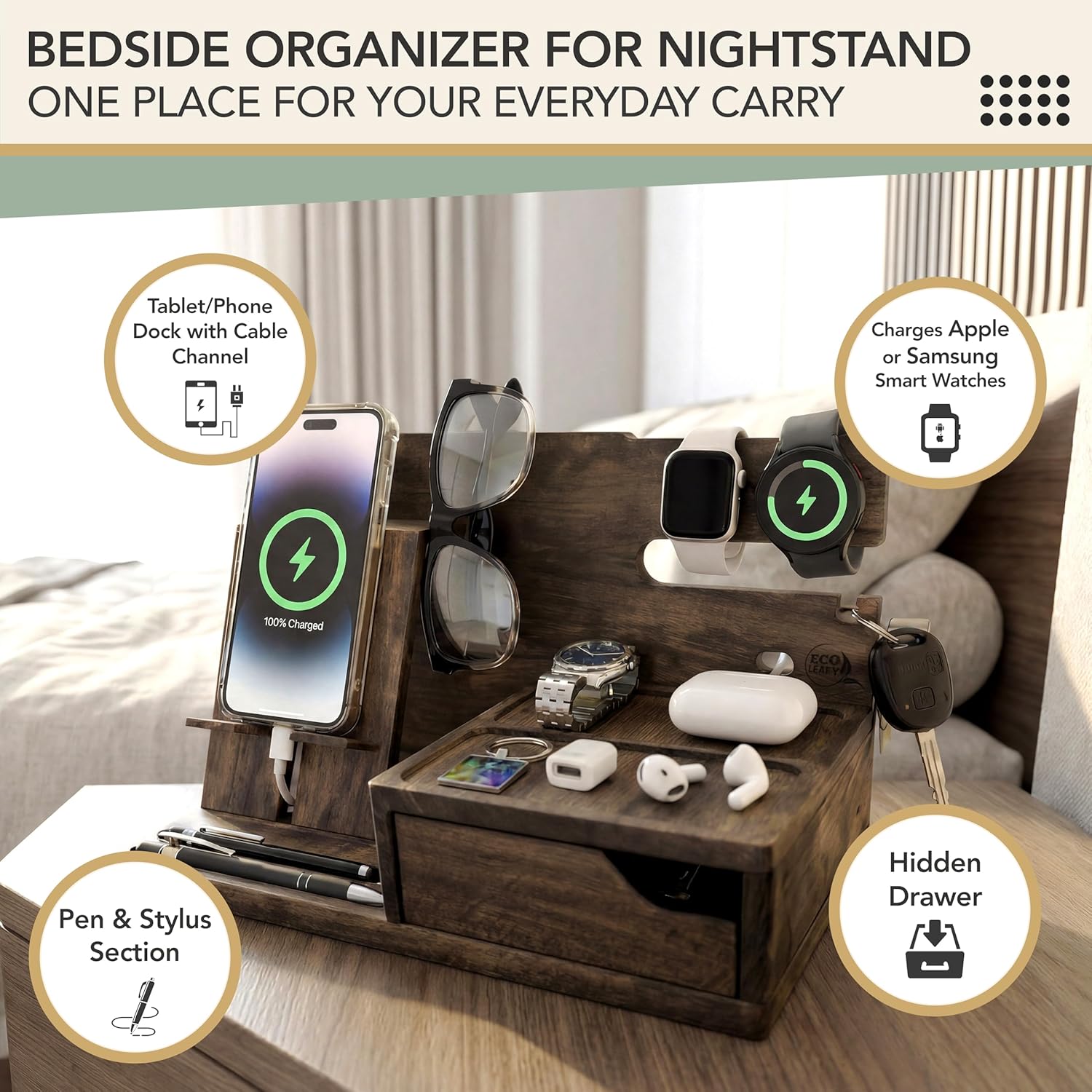 Nightstand Organizer- Phone Docking Station for Men- Unique Gifts for Husband, Father or Dad from Wife, Son or Daughter- Desk Organizer for Cellphone, Watches, Wallet and Key (Rustic)
