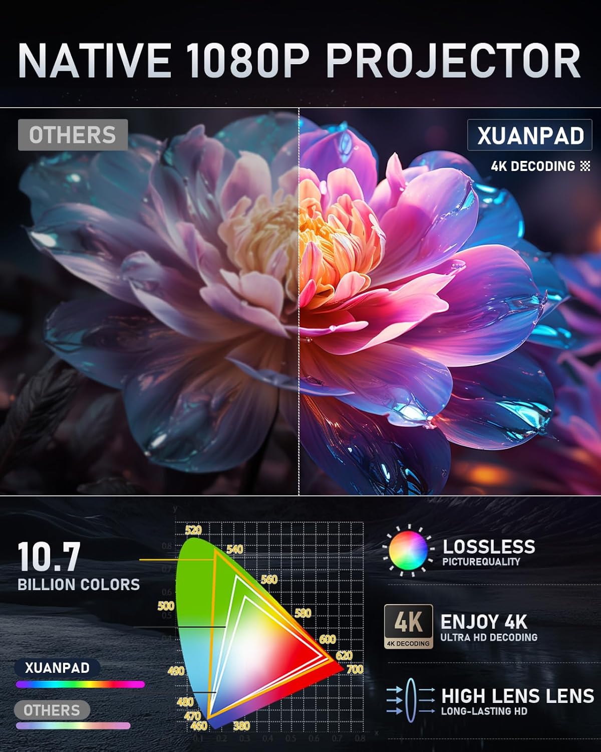 [Officially-Licensed App & Smart Focus]Smart Mini Projector with WiFi and Bluetooth, XuanPad 4K Support Movie Projector, Portable Native 1080P Outdoor Projector with 360° Stand