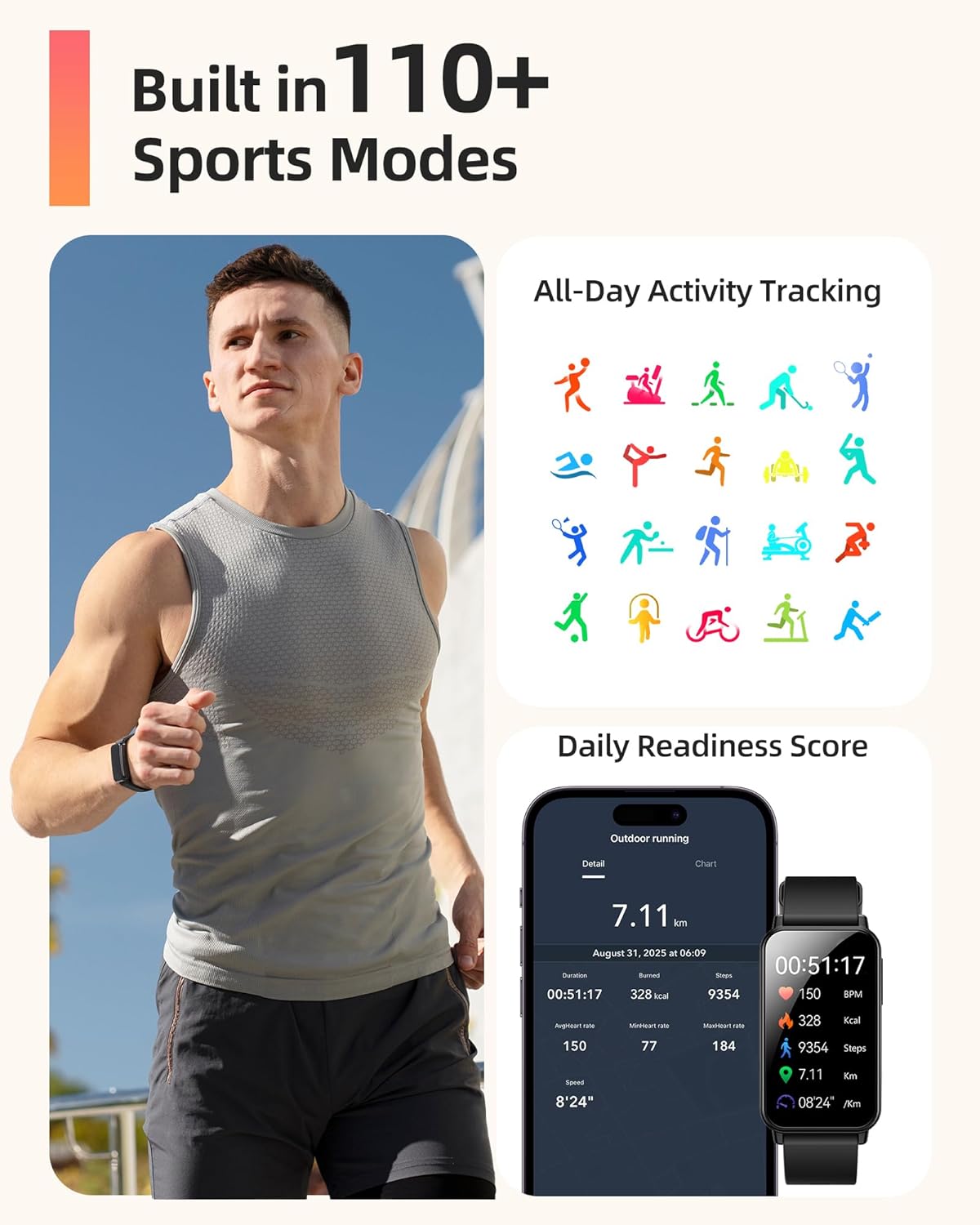 Parsonver 5ATM Waterproof Fitness Tracker, Swimming Smart Watch with Step Counter, Stopwatch, Pedometer, 24/7 Heart Rate/Blood Oxygen/Sleep Monitor, 110+ Sport Modes Fitness watch for Women Men, Black