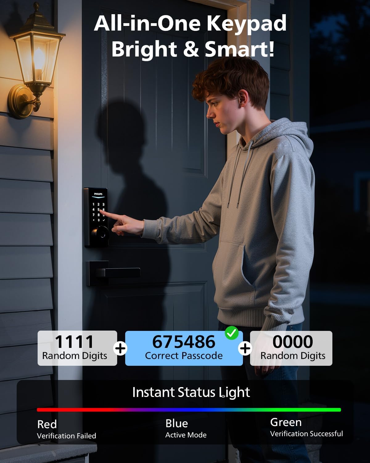 Philips Wi-Fi Smart Lock with Handles, WiFi Keyless Entry Front Door Lock Set, Keypad Deadbolt with Handle App Fingerprint Code Unlocking, Auto Locking, Built-in WiFi, Remote Control & Voice Unlock