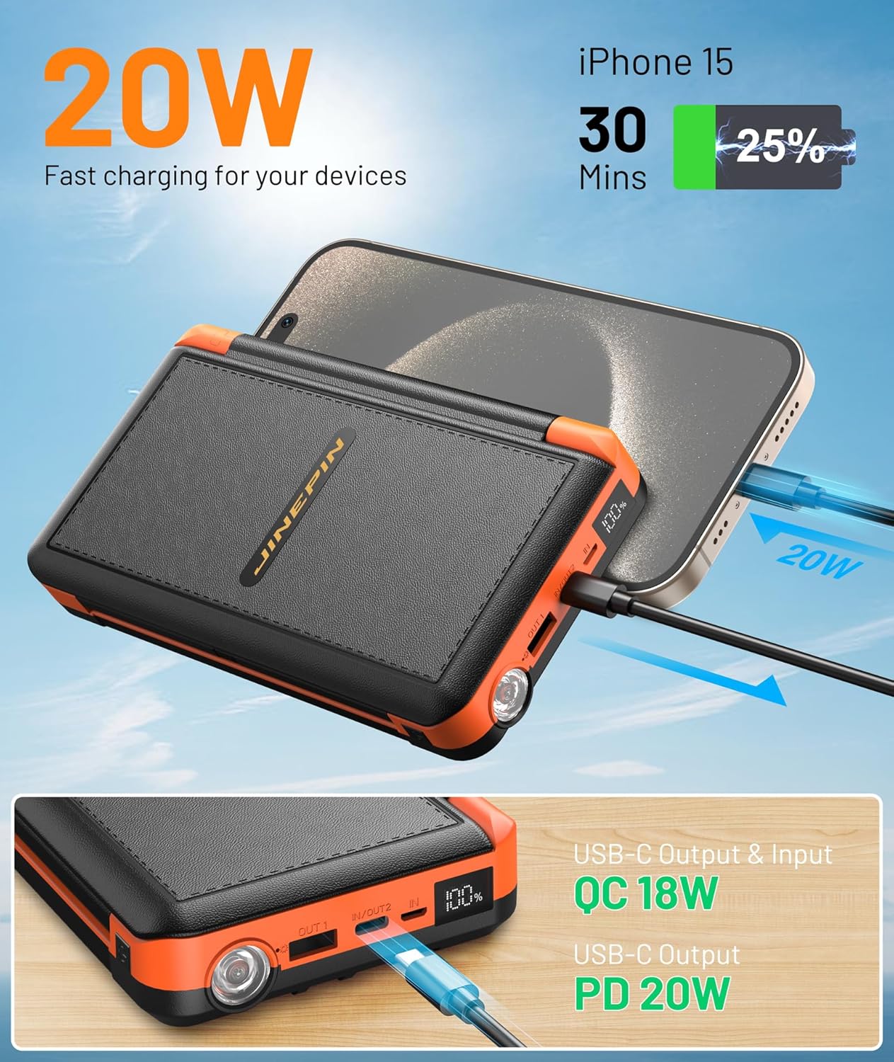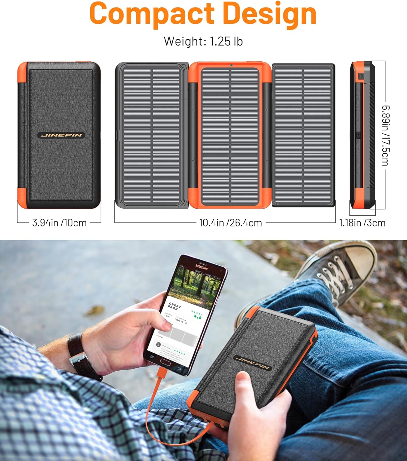 Power Bank Solar Charger 46800mAh Built in 4 Cables 3 Foldable Solar Panels, PD20W Fast Charging Portable Charger, LED Display Powerbank USB C in/Output, External Battery Pack with SOS Camping Light
