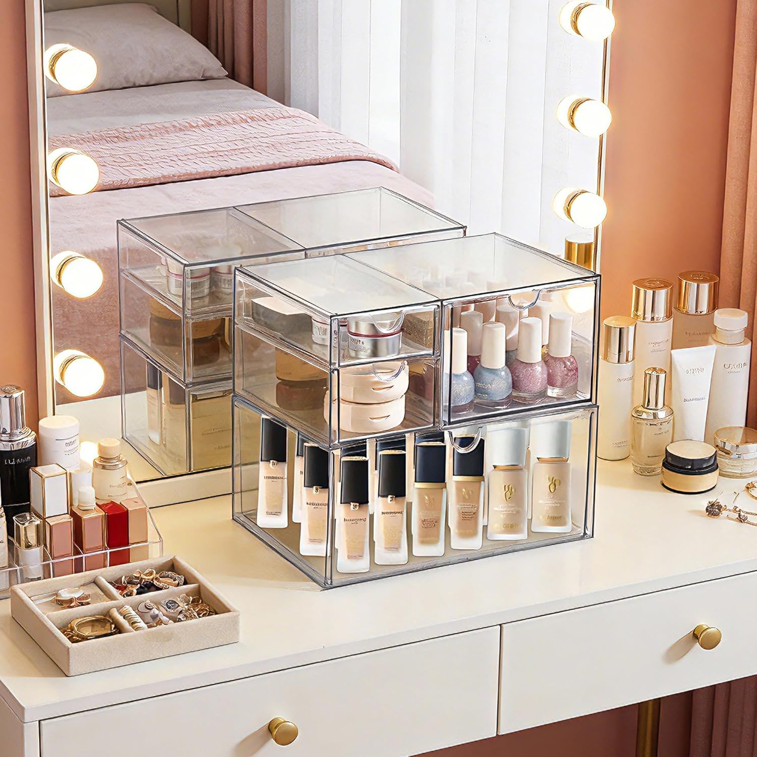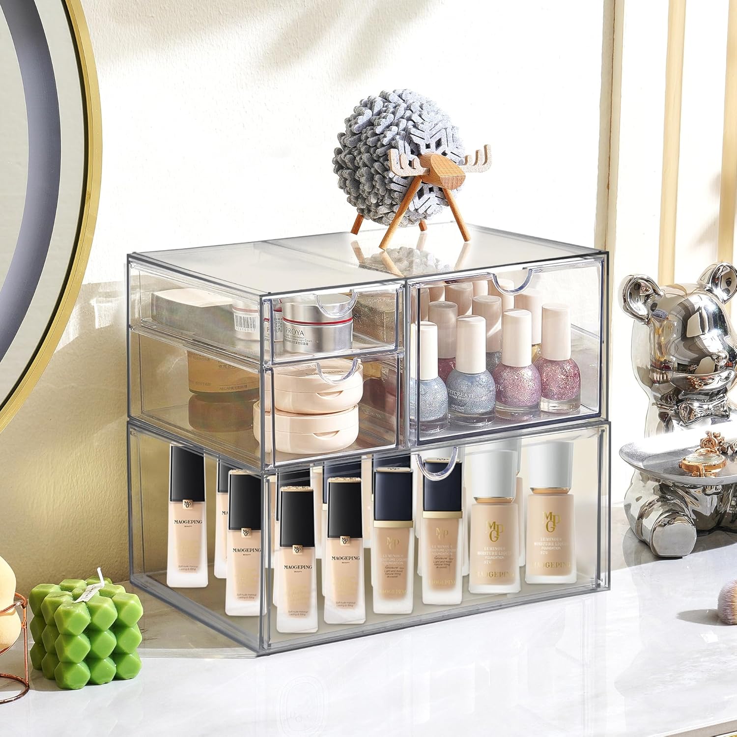 Prsildan Acrylic Drawer Makeup Organizer with 4 Drawers, Set of 2 Office Desk Organizers Accessories, Clear Stackable Storage Drawers for Vanity, Countertop, Craft, Jewelry, Art Supply Organization