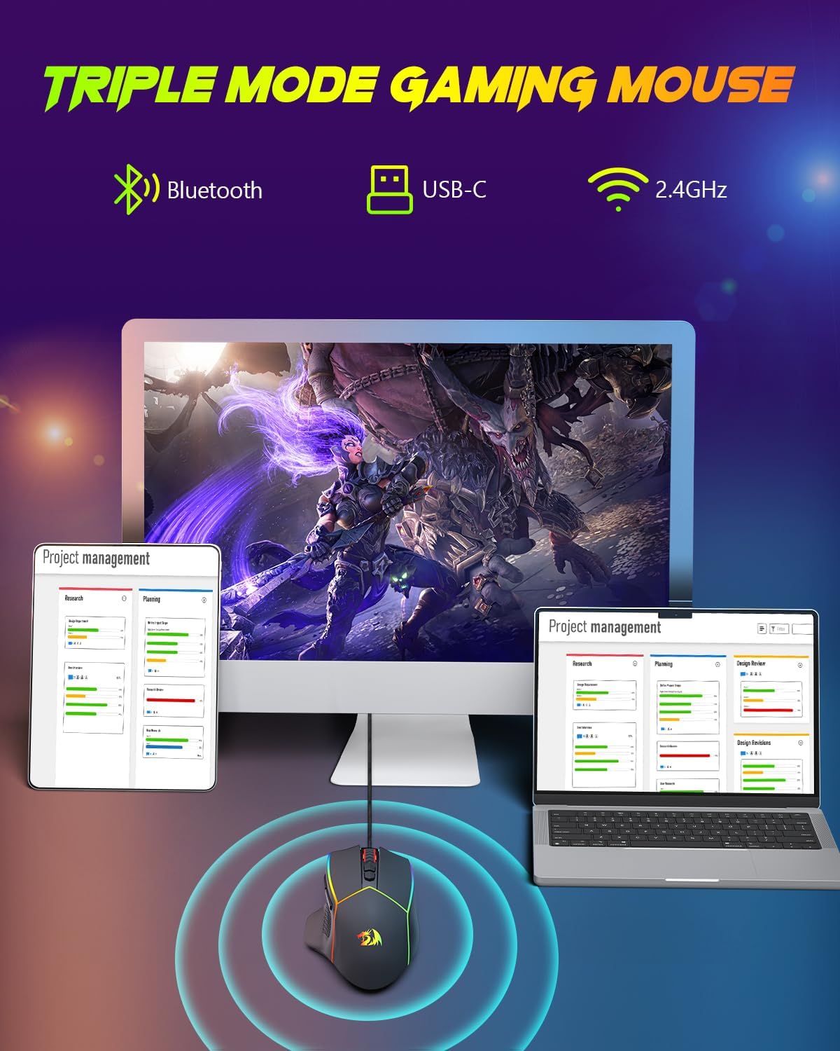 Redragon Wireless Gaming Mouse, Tri-Mode 2.4G/Bluetooth/USB-C, 7 Programmable Buttons, Tactile Rapid Fire Key, 8000 DPI RGB Ergonomic Mouse for PC Windows Gaming & Work, M814