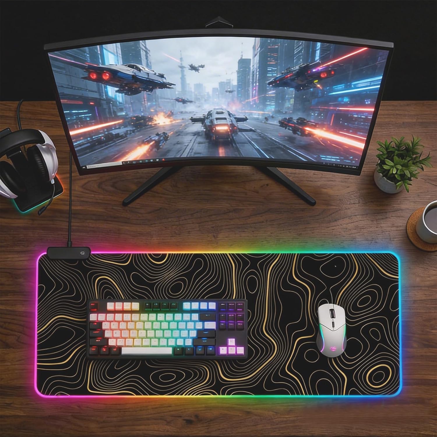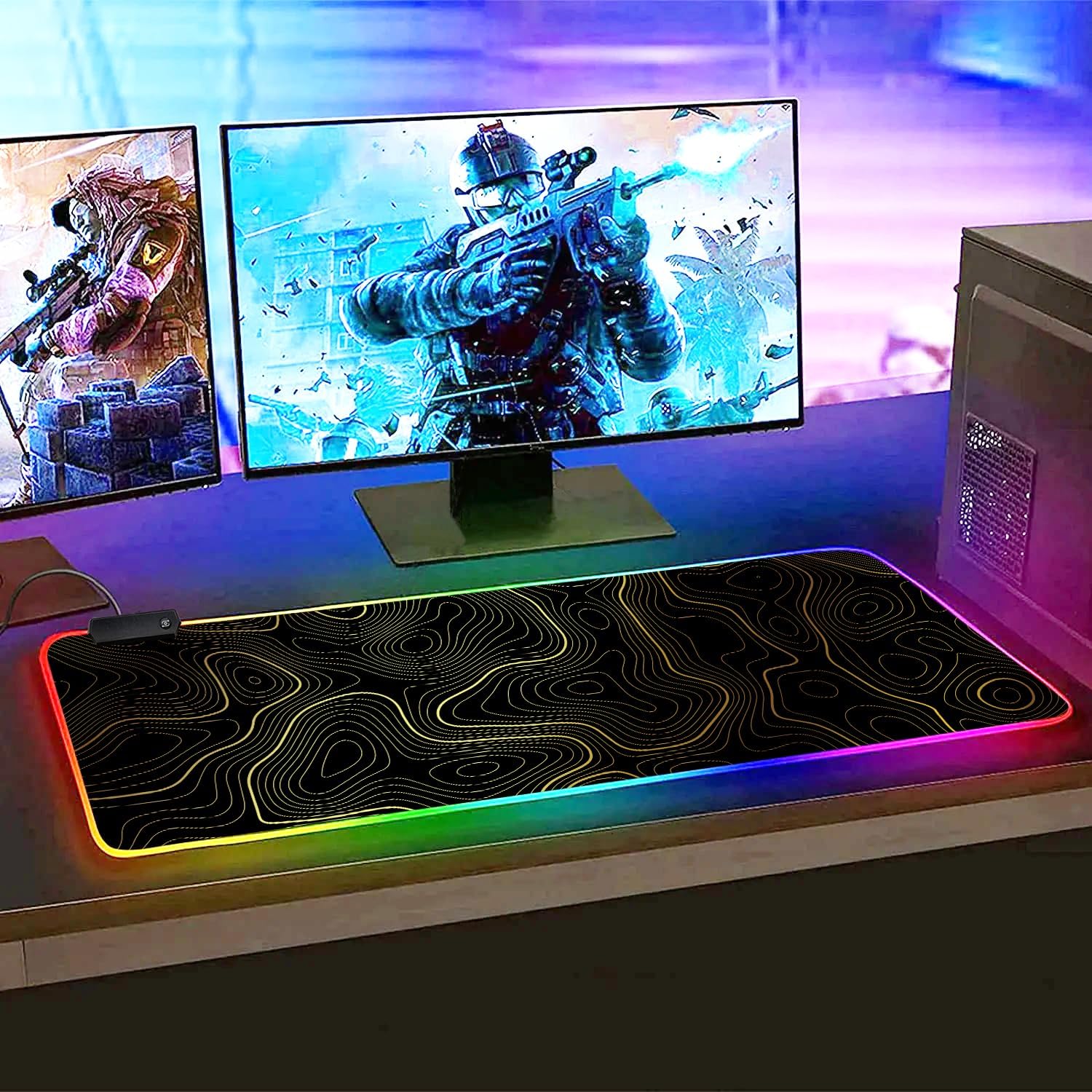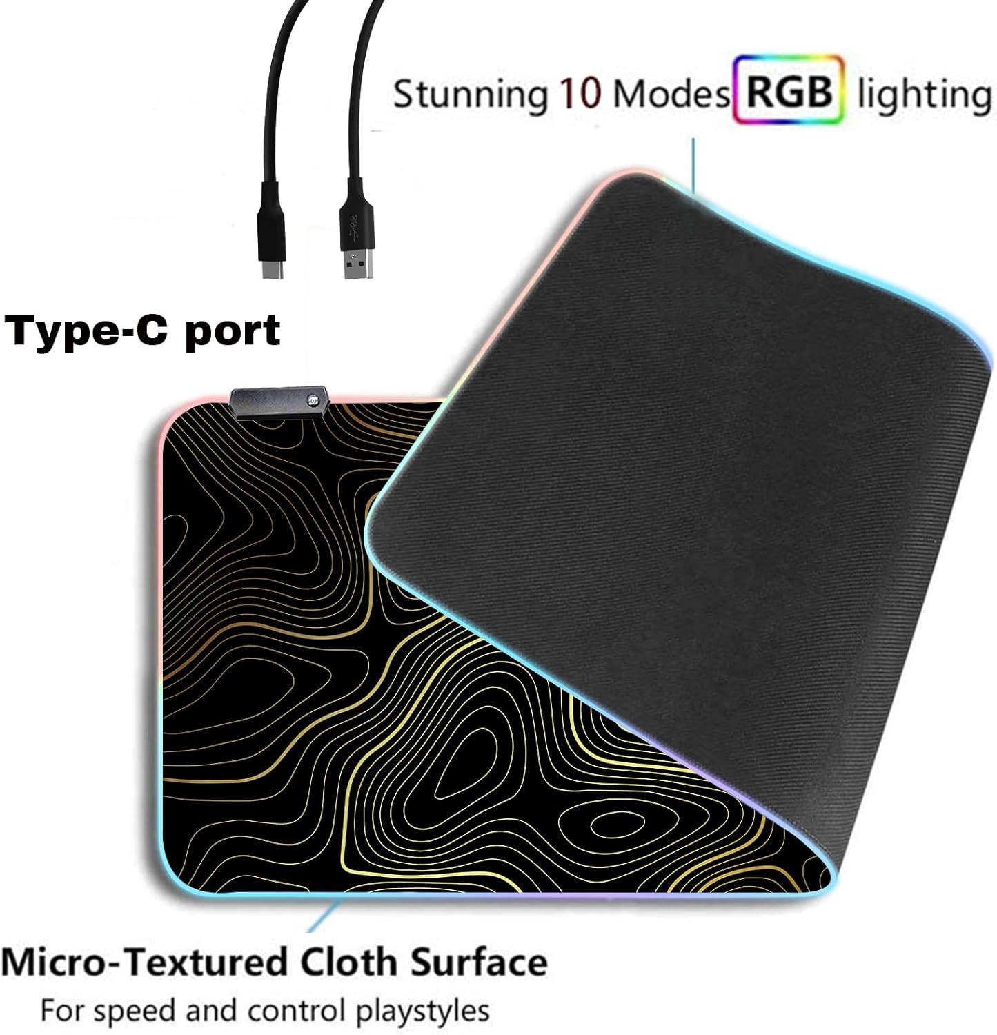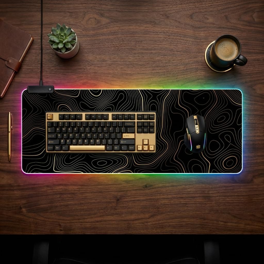RGB Mouse Pad LED Desk Mat Large Gaming Mousepad Black and Gold Line Design, Keyboard Pad XL Mouse Mat for Home and Office (Black with Gold Topographic Line)