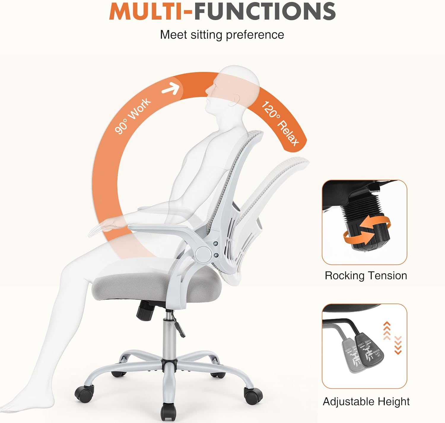 Sweetcrispy Home Office Managerial Executive Chair, Ergonomic Mesh Adjustable Swivel Mid-Back Chair with, Flip-up Arms, Comfortable Lumbar Support, Comfy Arms for Bedroom,Study,Student, Grey
