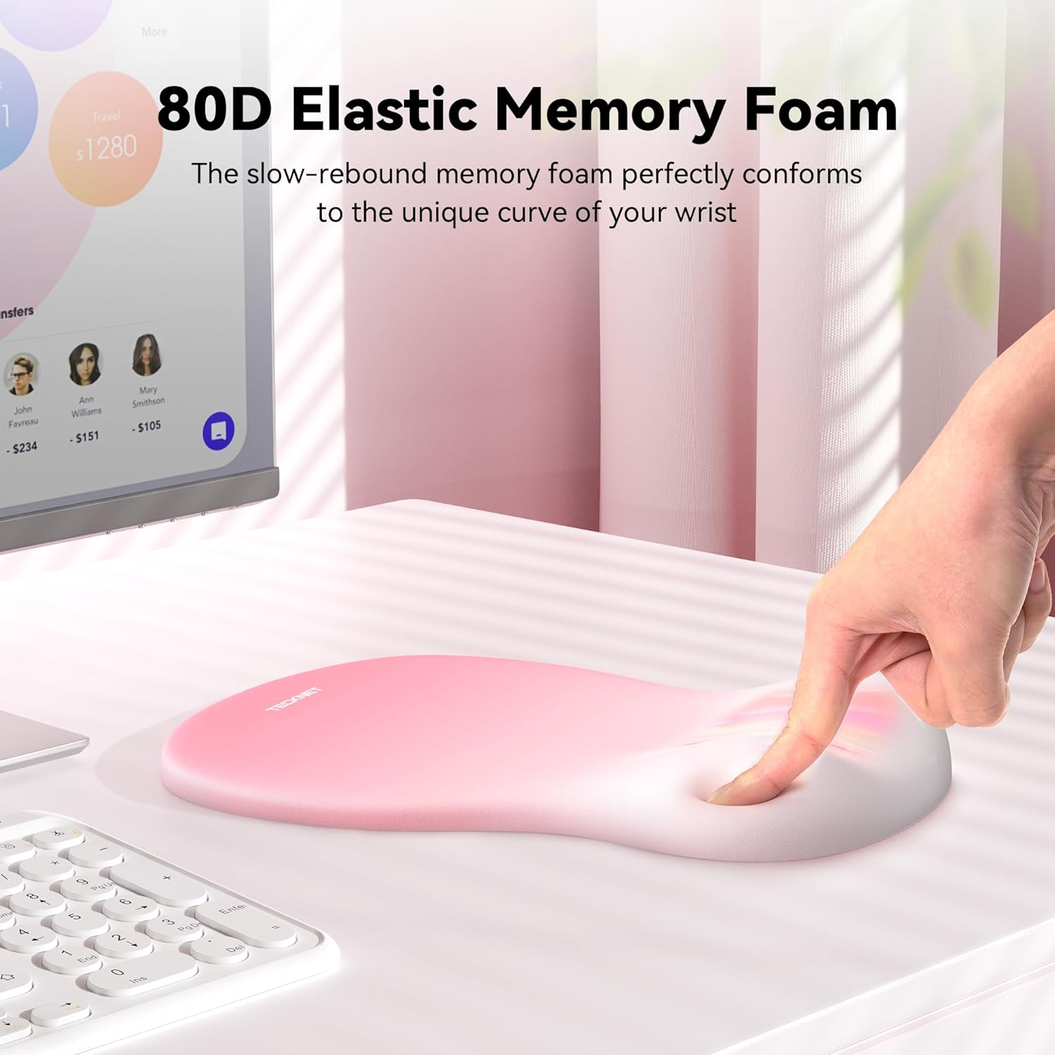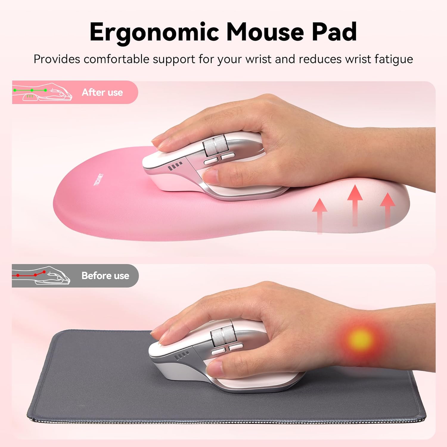 TECKNET Ergonomic Mouse Pad with Wrist Rest, Memory Foam Mousepad with Wrist Support, Smooth Surface, Middle Concave & Non-Slip Base for Laptop/PC, Pain Relief for Home Office Gaming, Pink