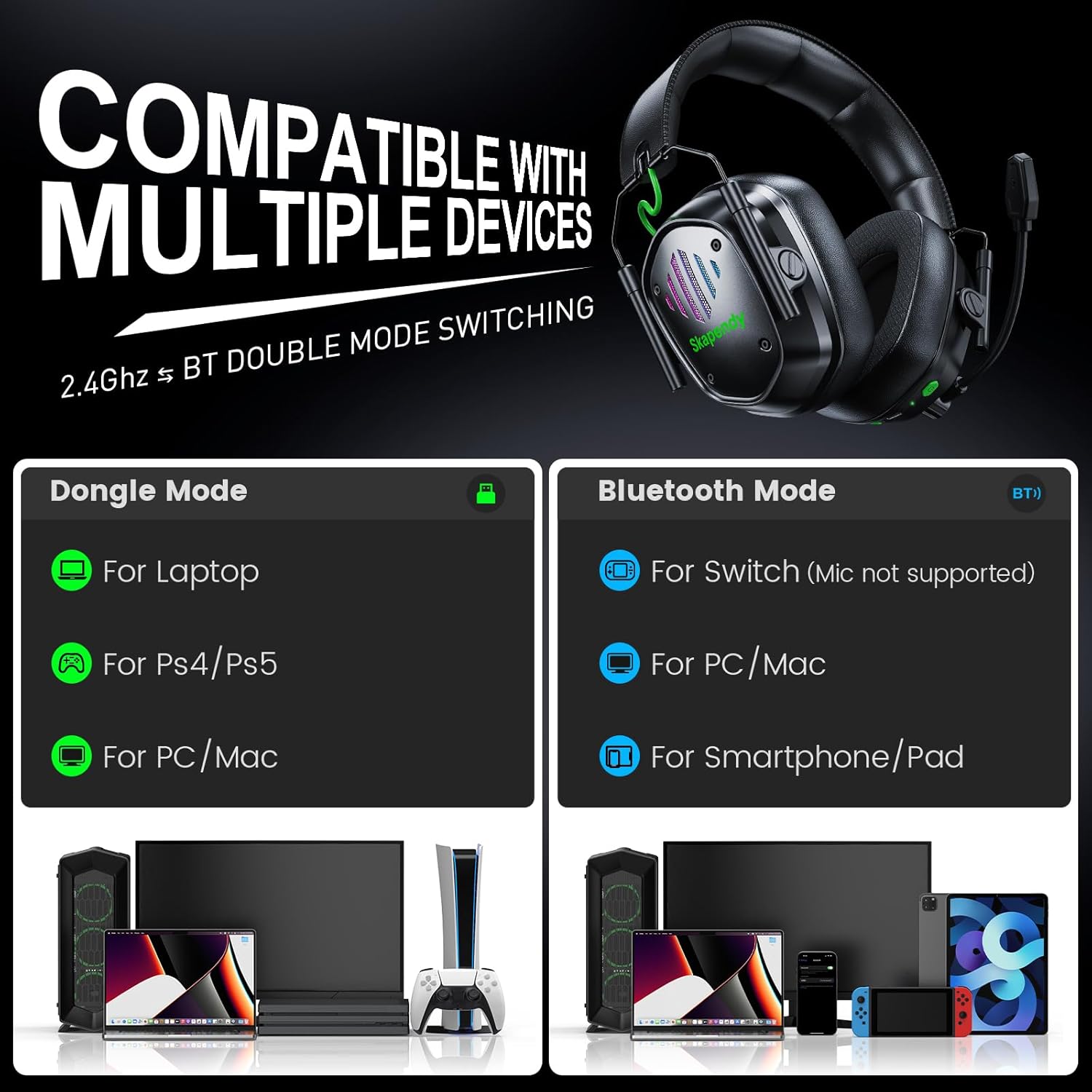 The Wireless Gaming Headset for PS5, PS4, PC, and Switch is designed to enhance your gaming experience. With 2.4GHz and Bluetooth connectivity, you can enjoy seamless audio without the hassle of wires. The headset features 3D stereo surround sound, delivering immersive audio that helps you stay aware of your surroundings in-game.
