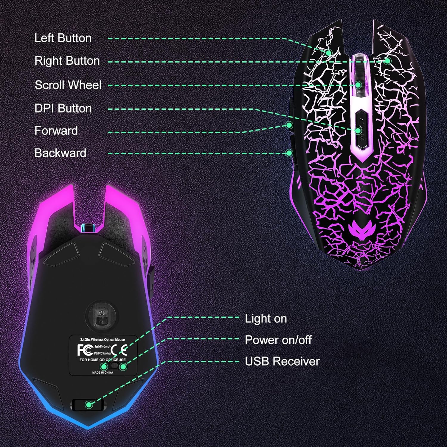 Wireless Gaming Mouse, Rechargeable Wireless Computer Mouse, 7-Color LED Light, Ergonomic Mouse with 6 Silent Click Buttons, 3 Adjustable 2400 DPI Wireless Mouse for Laptop,PC,Mac, Black