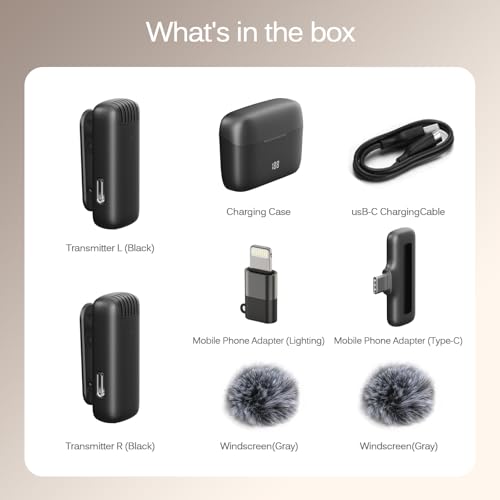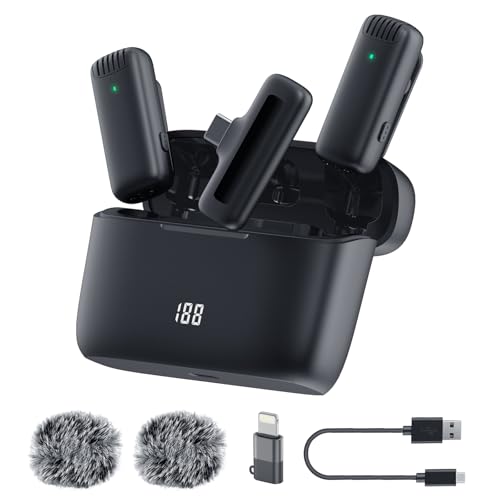 Dual Wireless Microphones for iPhone This dual wireless lavalier microphone set built-in noise reduction chip, real-time auto-sync technology, and 2.4G signal transmission with super low latency(0.008s), the sound picking-up follows the picture in real-time. Lapel microphone wireless can easily cope with various noisy environments and truly restore human voices.